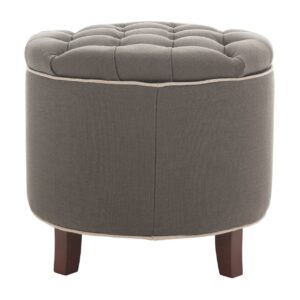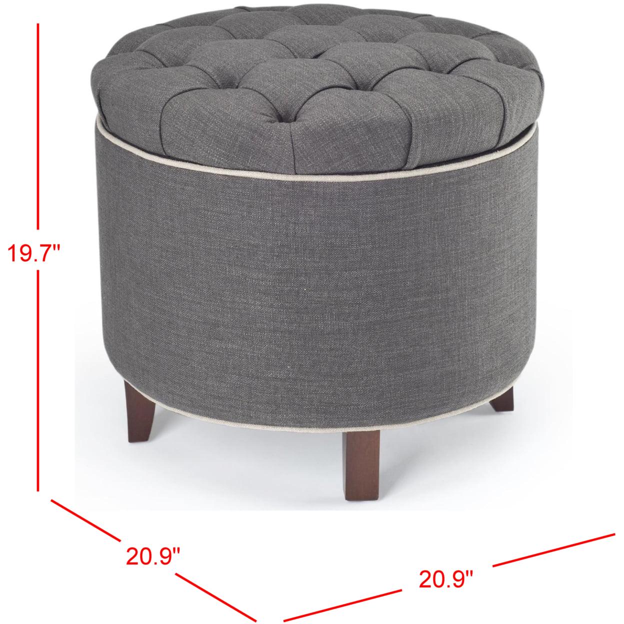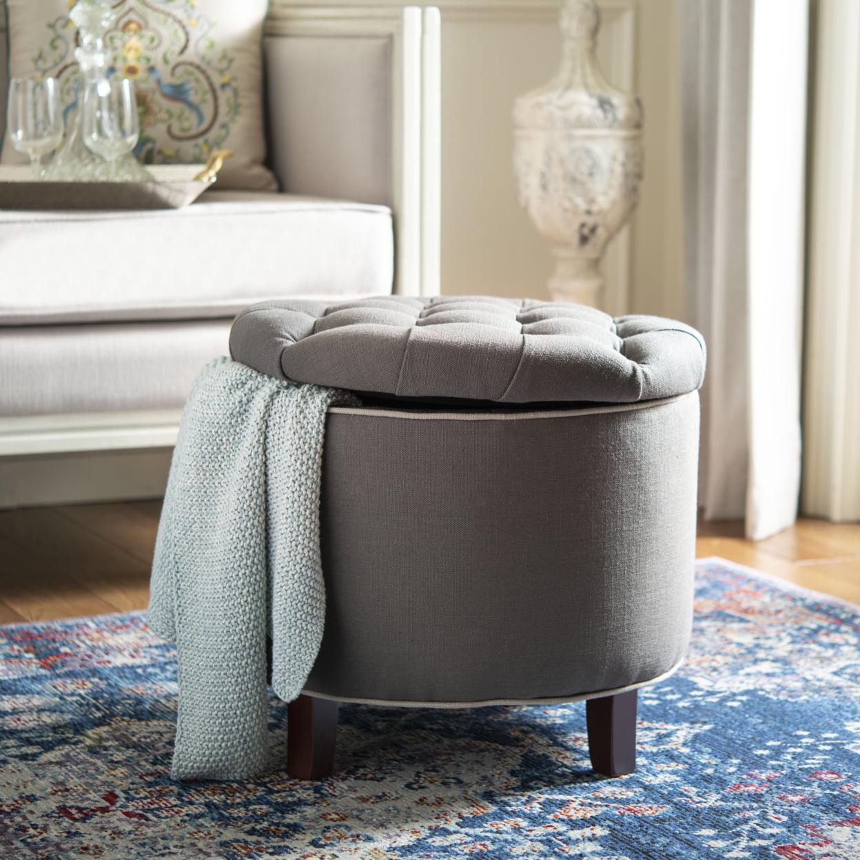 SAFAVIEH Amelia Tufted Storage Ottoman Charcoal / True Taupe The fashion smart storage accessory, this Amelia Ottoman is ideal for any decor with its button tufted top and oak legs in a cherry mahogany finish. The charcoal linen blend fabric is accented with contrasting white piping for upscale chic.