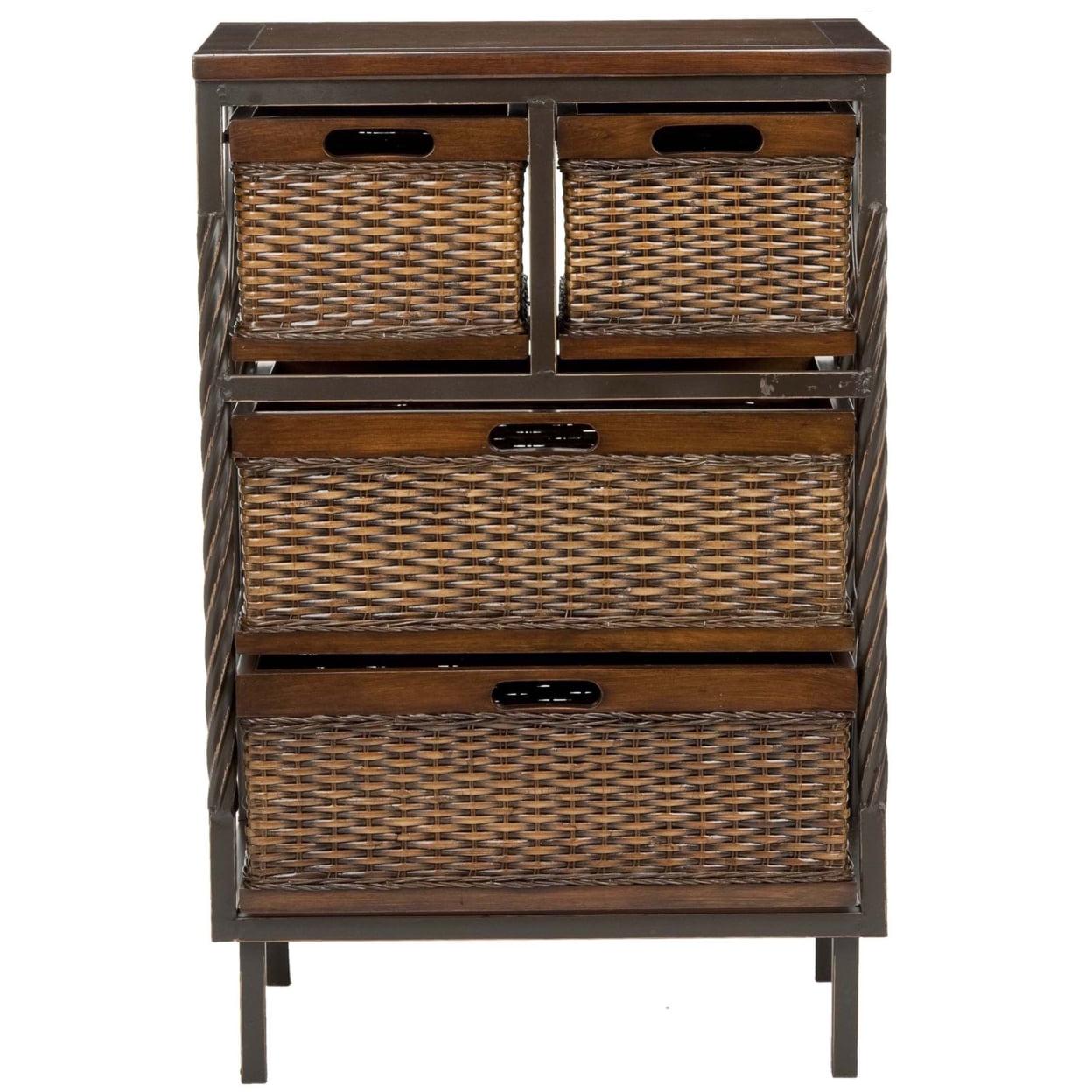 SAFAVIEH Andrew 4-Drawer Storage Unit Teak The Andrew Storage Unit elevates traditional British Colonial style for today’s coastal interiors. Andrew flaunts delicately carved details on its dark teak finished pine frame, pairing perfectly with the rich texture of its four rattan baskets.