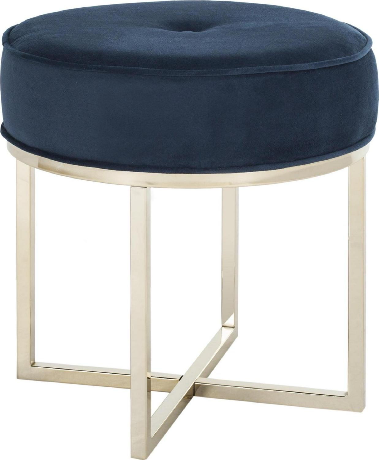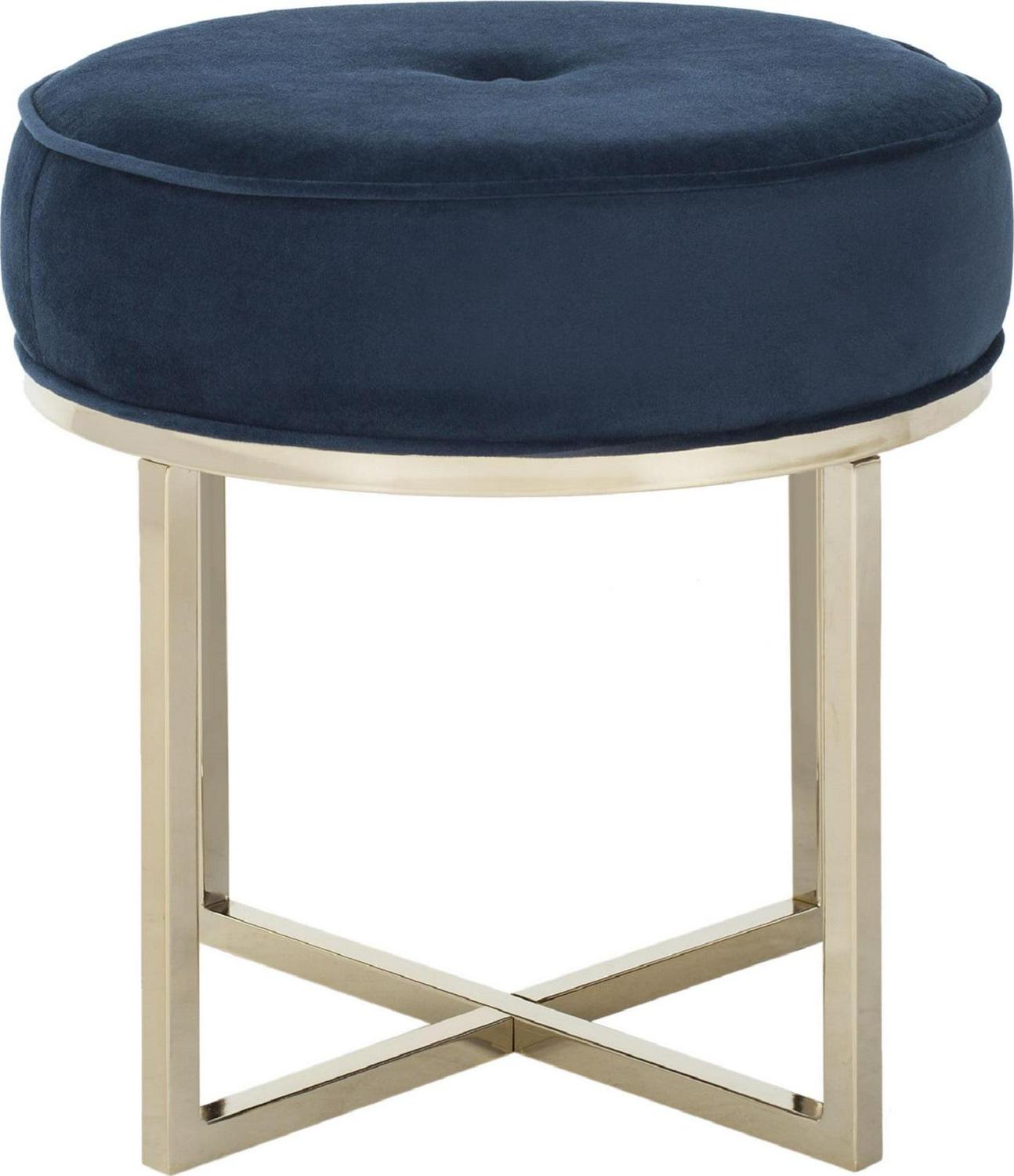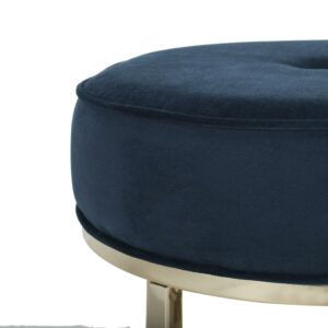 A perfect pairing of minimal lines while still conveying luxurious style, this contemporary round ottoman updates any living room. Designed with velvet upholstery in a soothing navy hue, it complements any d cor. Its modern brass legs add an elegant sculptural touch.