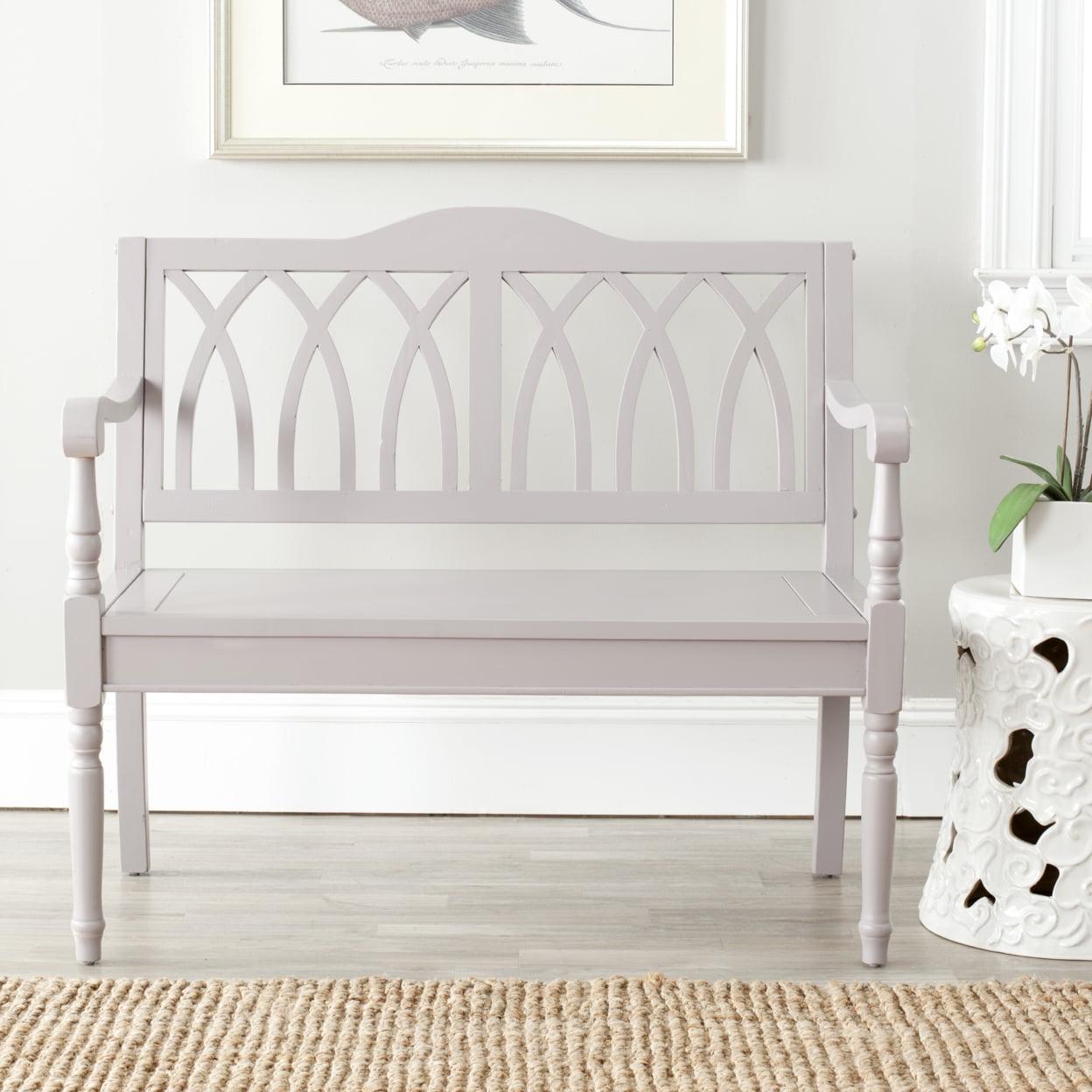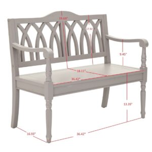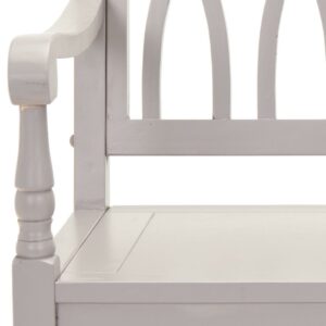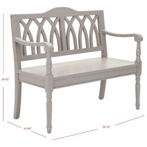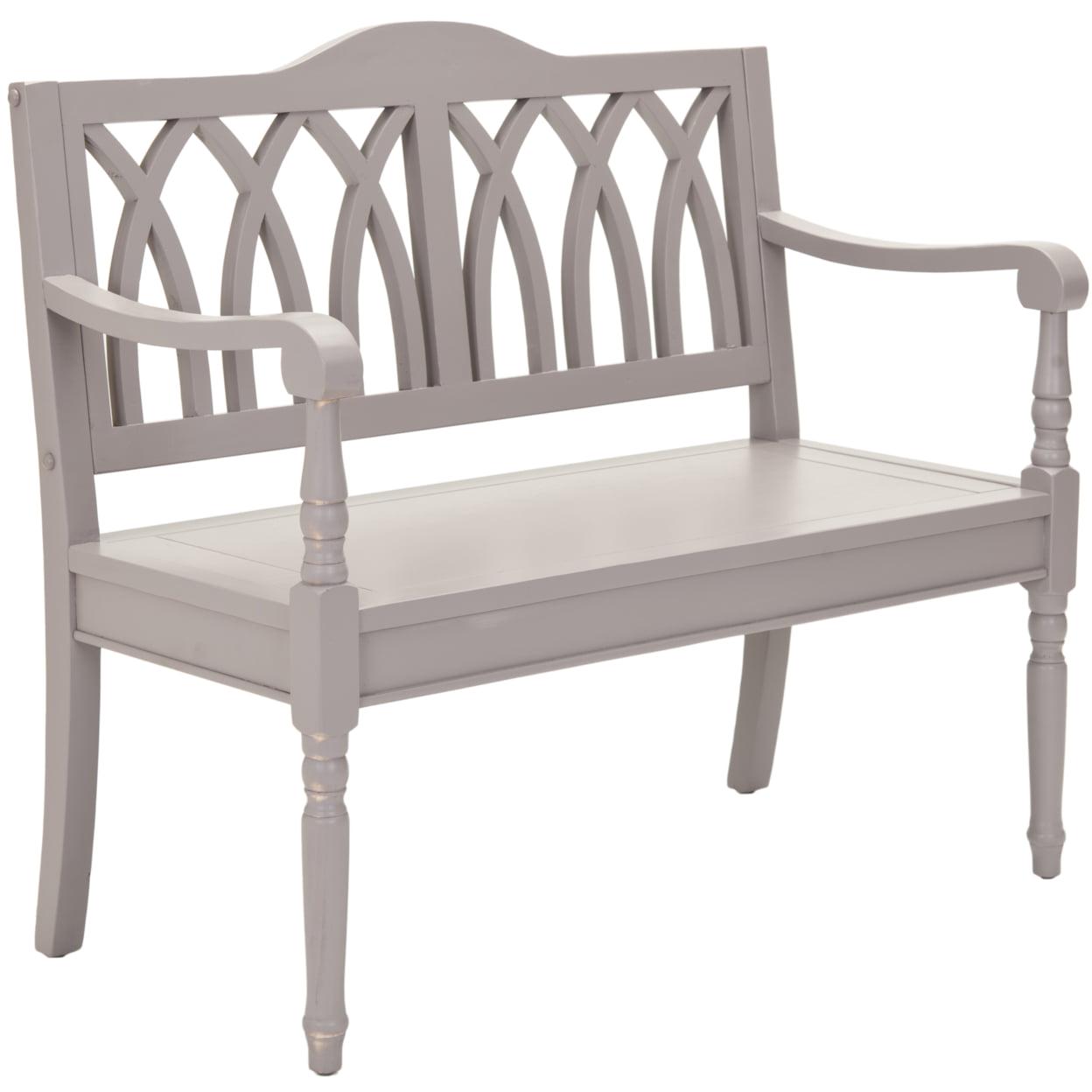 SAFAVIEH Benjamin Bench Quartz Grey The Benjamin Bench takes a classic garden form and transports it indoors. Elegant finials on the sides and arms with a back motif inspired by Gothic architecture transform its quartz grey pine wood frame into a striking statement appropriate for any interior.