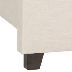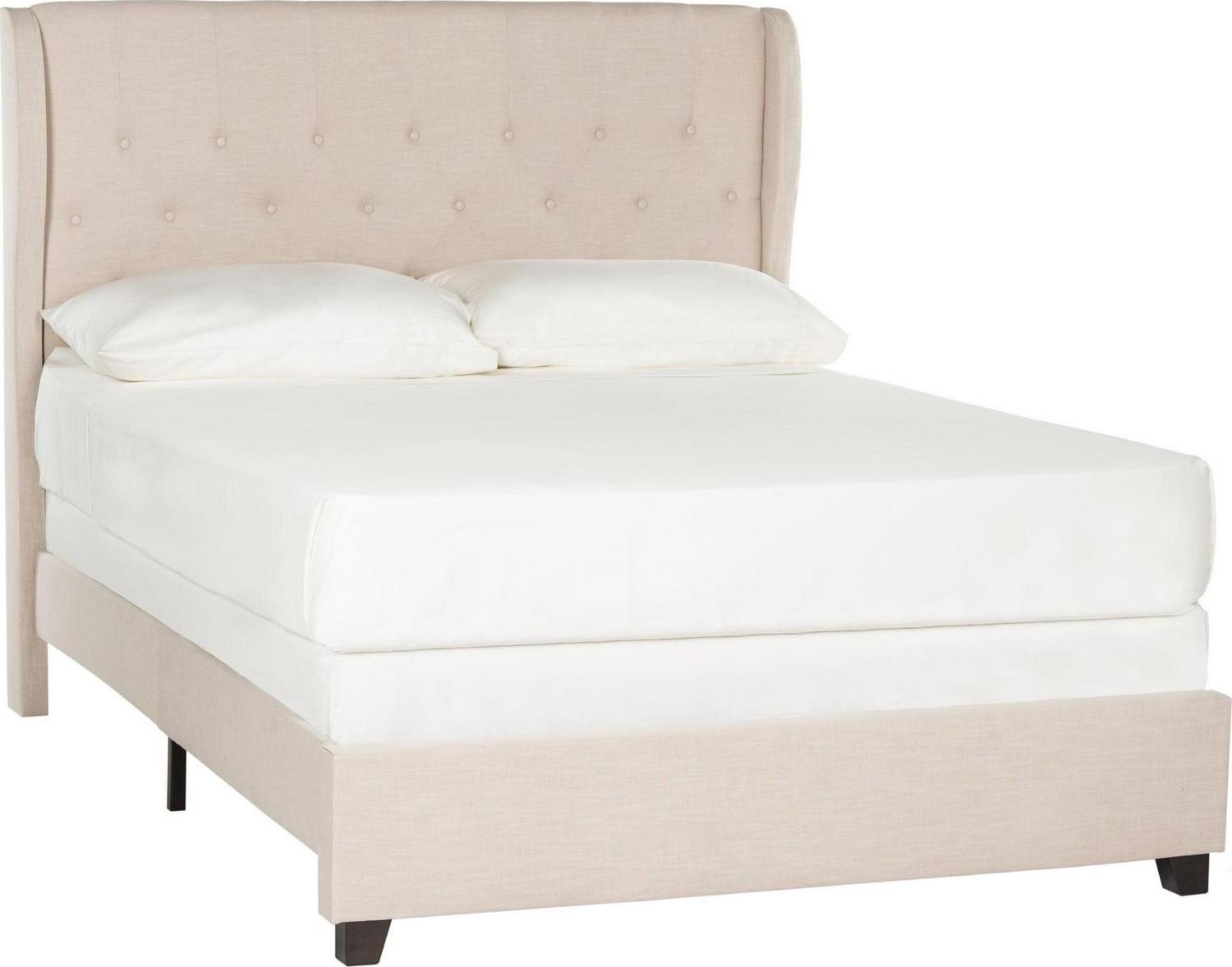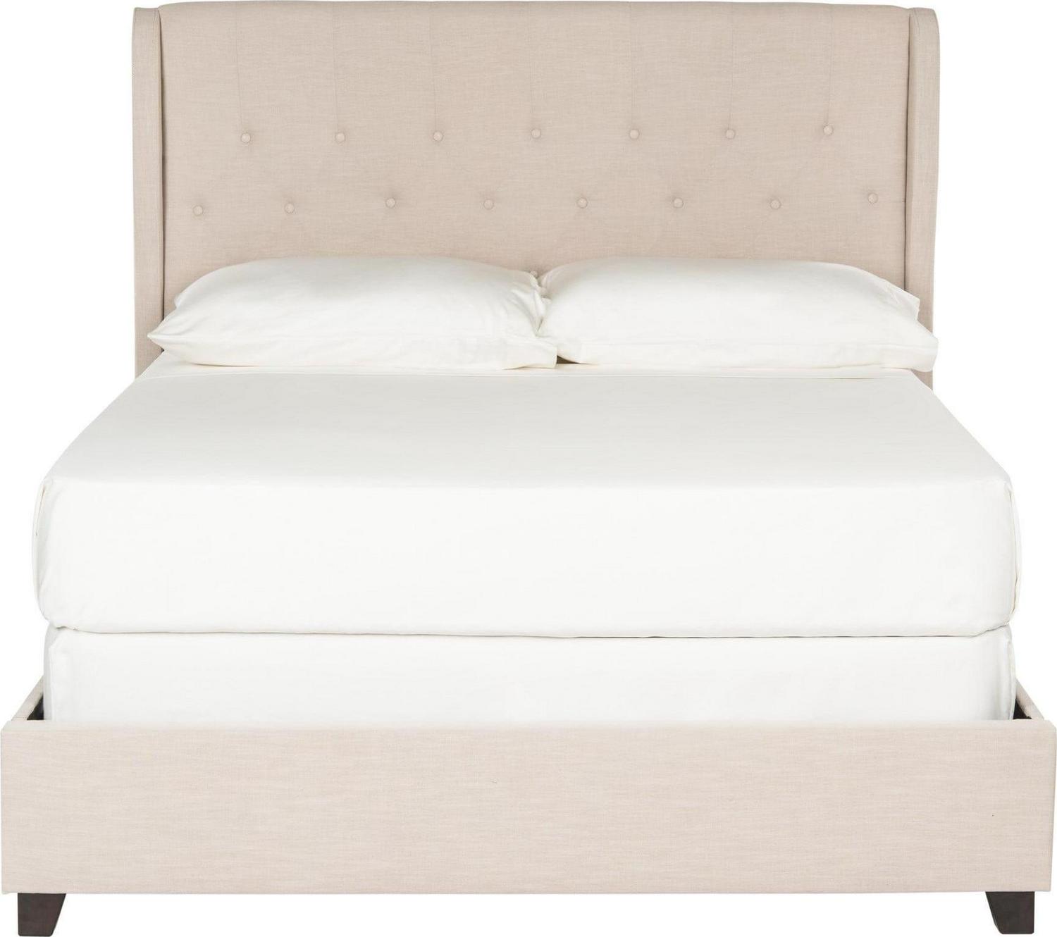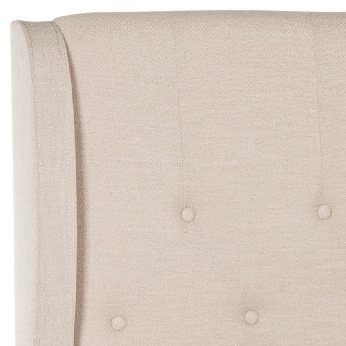 Indulge in the luxury of a fully upholstered bed with all the elegant touches of a custom design. Light beige pure linen covers everything from a button-tufted headboard with enveloping wing arms to its footboard with espresso rubberwood legs.