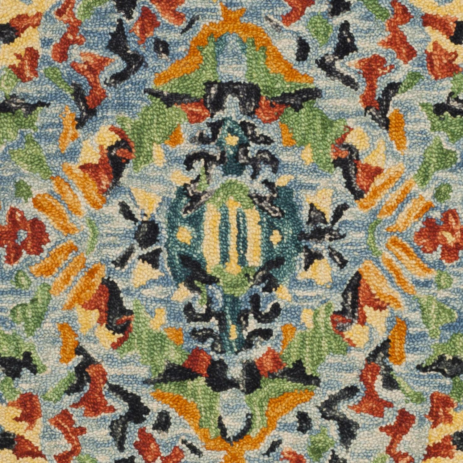 SAFAVIEH Blossom BLM452A Handmade Blue / Multi Rug The rugs of the Blossom Collection are bold, colorful updates of classic hooked rugs. Made using large hand woven loops, the texture of Blossom rugs inspires a fresh approach to country casual interiors. Woven of 100-percent premium wool, Blossom area rugs bring traditional English chintz and block print motifs into today’s cultured home decor. Rug has an approximate thickness of 0.5 inches.