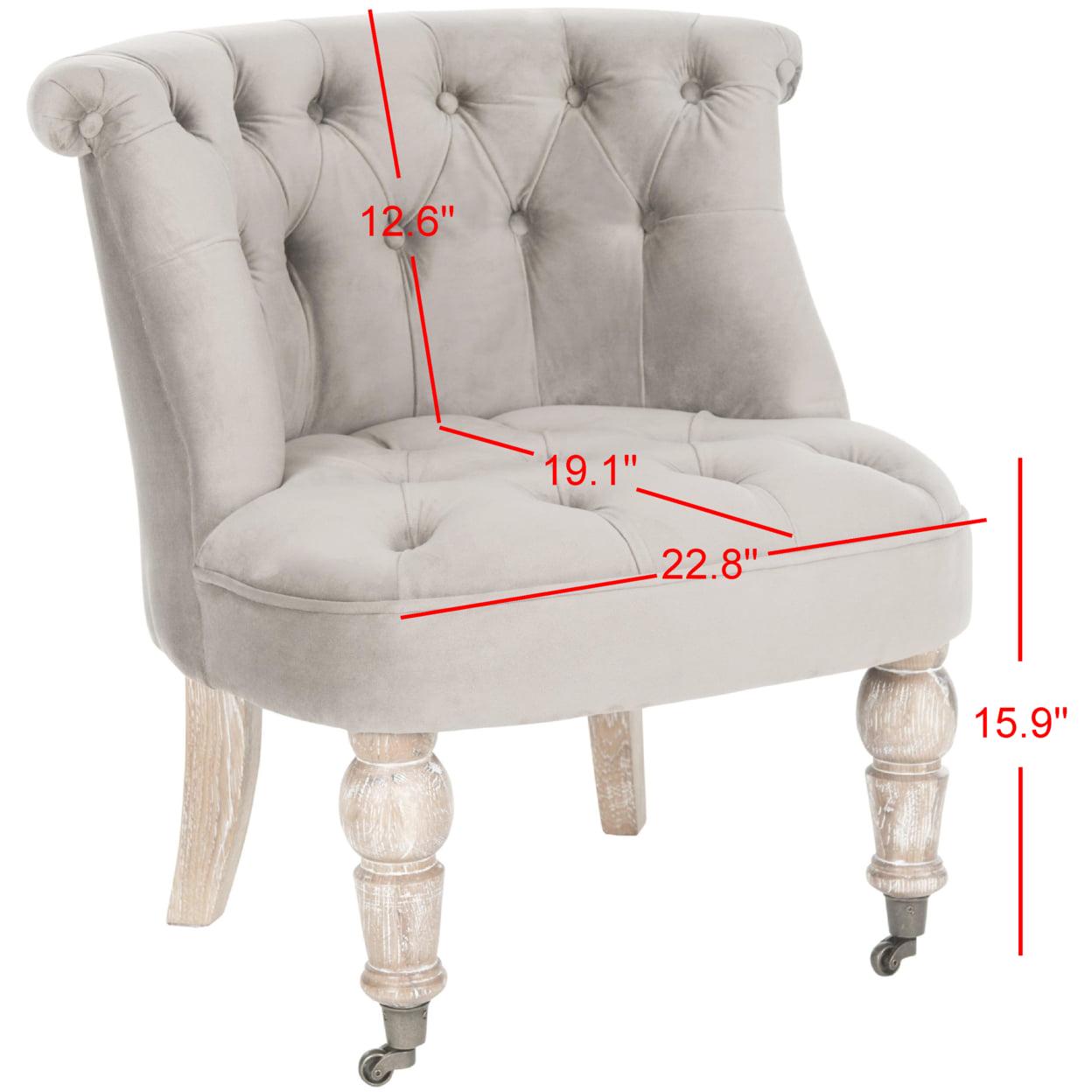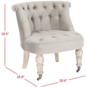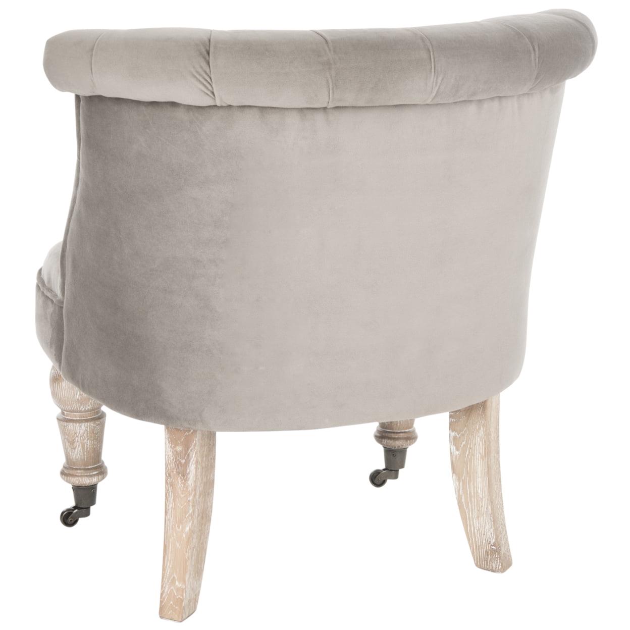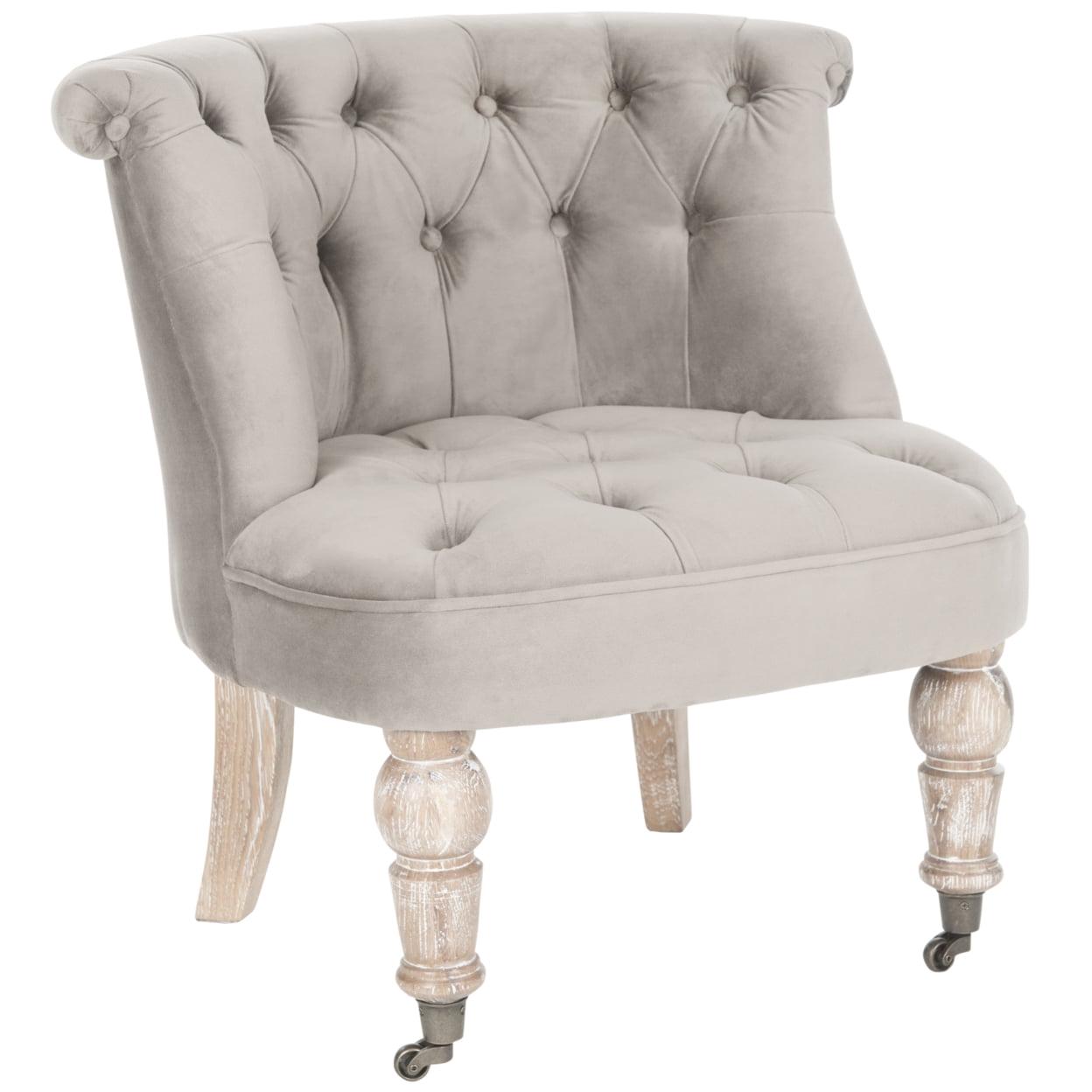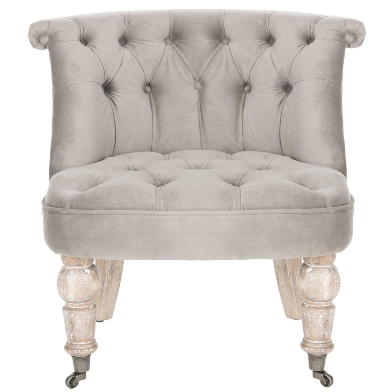 SAFAVIEH Carlin Tufted Chair Mushroom Our Carlin Tufted Chair in mushroom taupe cotton is full of tradition. Inspired by 18th Century English furniture, Carlin features lavish button tufting and lovely birch wood legs in a white washed finish. Perfect as a side chair or bedroom chair, Carlin comes with casters for easy of movement.