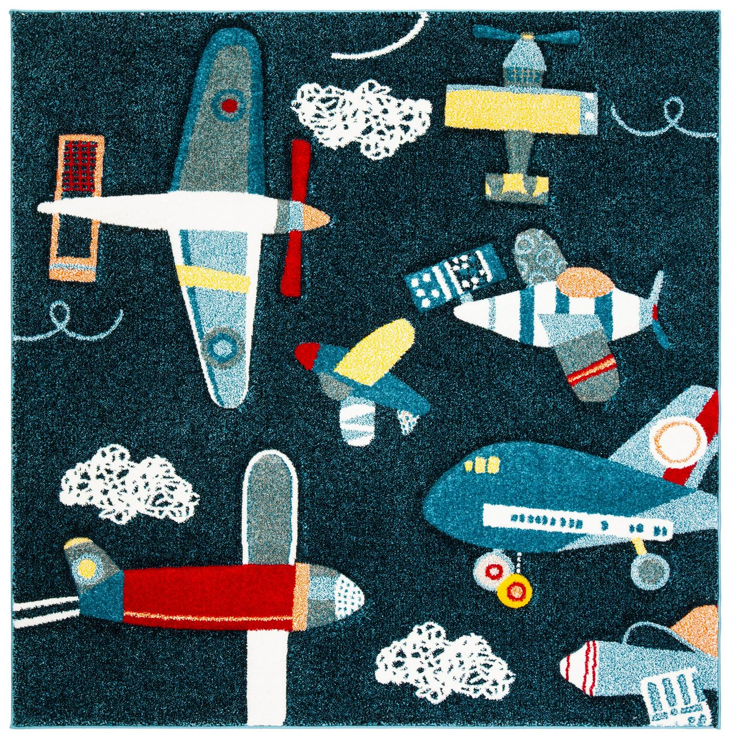 SAFAVIEH Carousel Kids Collection CRK167N Navy/Ivory Rug Carousel Kids Rugs turn fanciful storybook animals and beloved motifs into colorful decor for kids. With pleasing hues and playful etched designs, these delightful kid’s rugs sparkle in children’s favorite rooms. Carousel Kids rugs are machine-woven using soft yet durable synthetic yarns for lasting beauty even when subjected to years of busy little feet. Rug has an approximate thickness of 0.5 inches.
