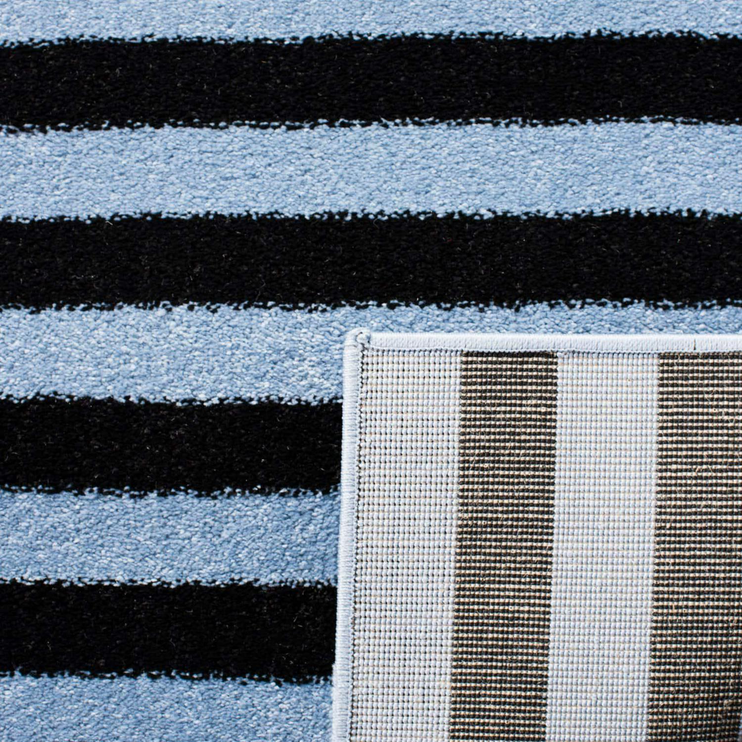 Add a fun touch to the nursery or playroom with the Safavieh Carousel Kids Puppy Indoor Area Rug. This black and blue striped rug features a gray dog in the center.
