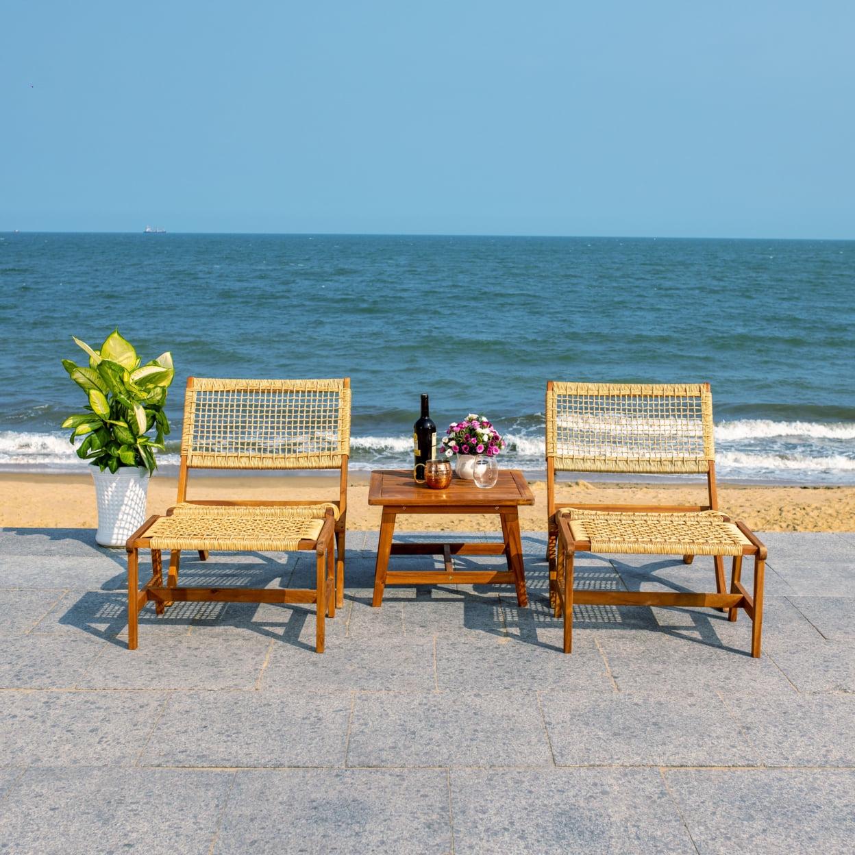 This Casella Set allows you to stretch out and enjoy the summer breeze with ease and style. Two natural finished acacia wood chairs and matching ottomans allow for lavish lounging in the sunshine, and an end table provides ample space for coffees, cocktails, or snacks. This living set easily blends and complements your patio, backyard, or living space. Add a touch of classic charm to your home with this remarkable piece.