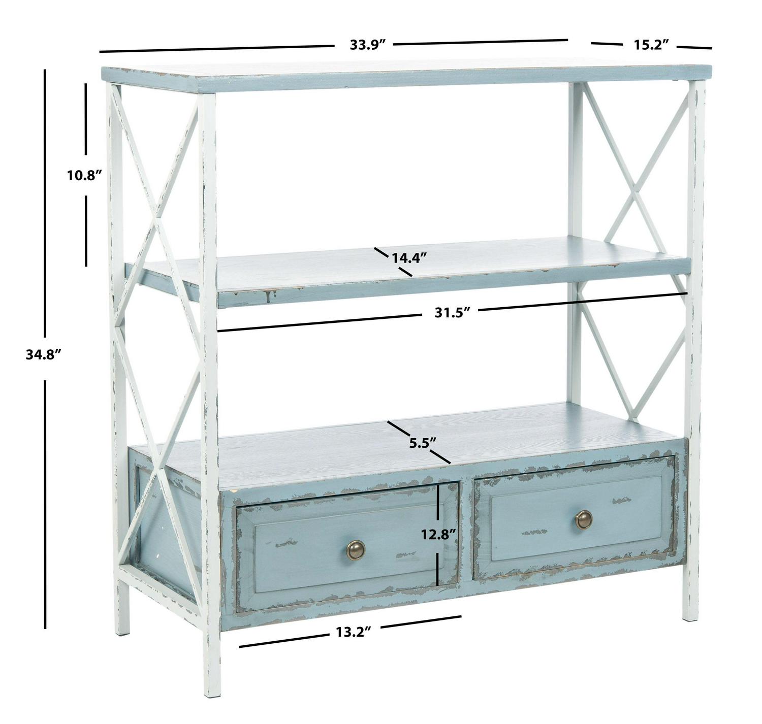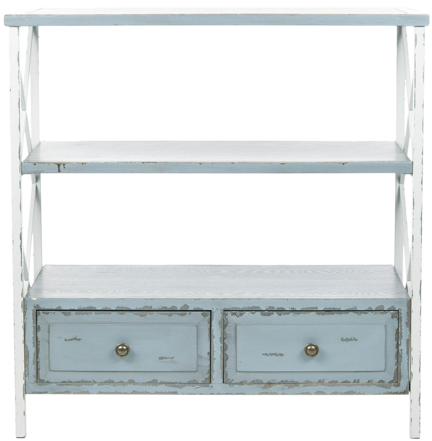 Romantics will fall for the feminine wiles of the Chandra console by Safavieh. Brimming with vintage charm, this piece is crafted with distressed finishes on its white iron X-frame and on contrasting pale blue shelves and drawers. Pretty and functional Chandra is ideal for coastal or country interiors.