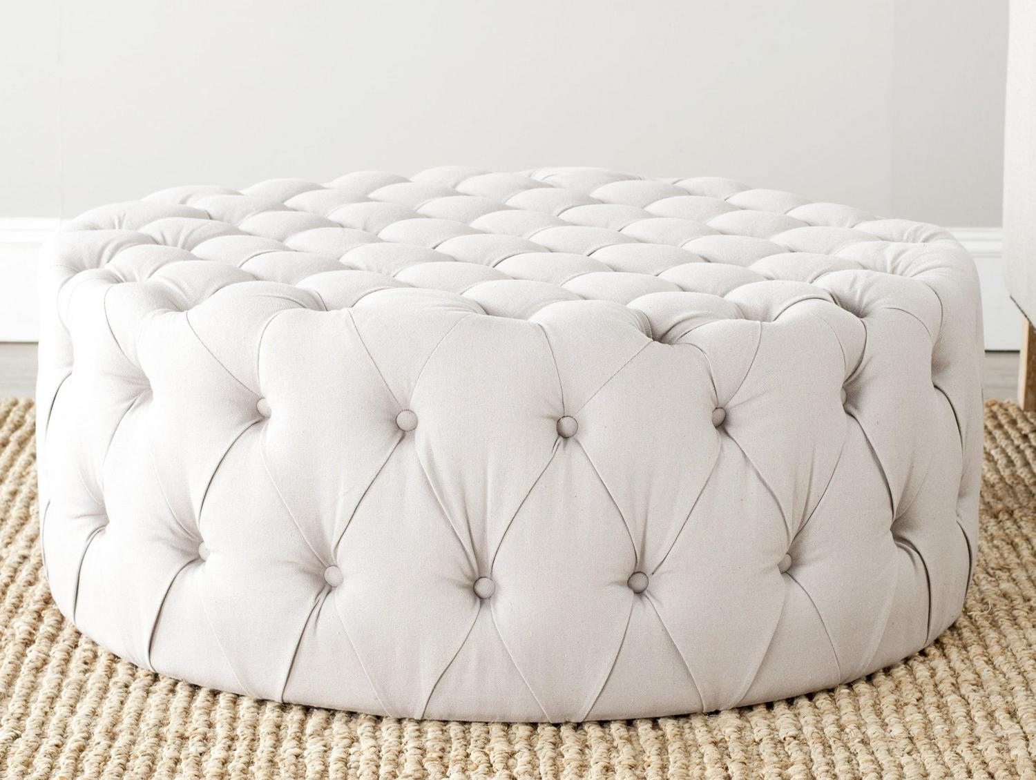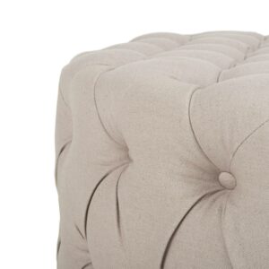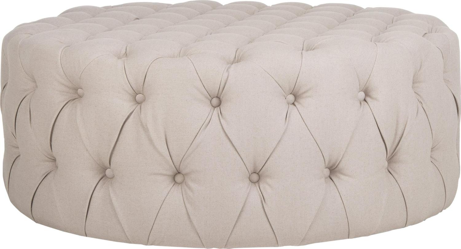 Brimming with sophistication, the elegant Charlene Ottoman recalls the 1930s Hollywood glamour with its lavish taupe linen fabric button-tufted on all sides. The oversized round shape and foam fill create a wonderful surface for use as a coffee table or extra seating.