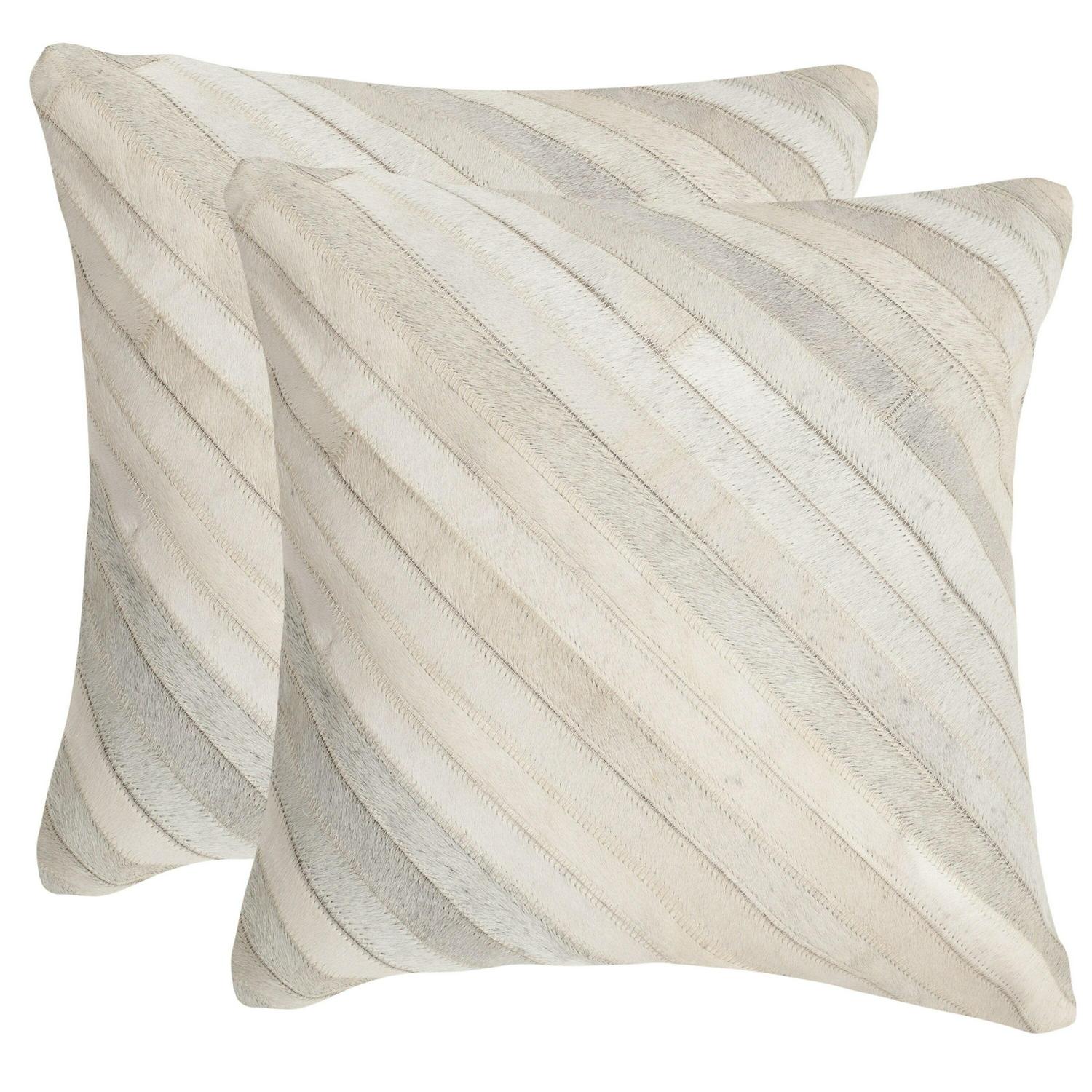 The luxe look of white cowhide is sensual and tactile with thediagonal motif of this set of two Cherilyn accent pillows. Stripsof cowhide are sewn together to create an elaborate patchworkeffect in these contemporary square pillows..