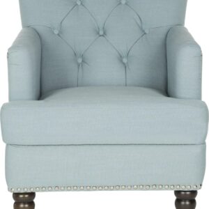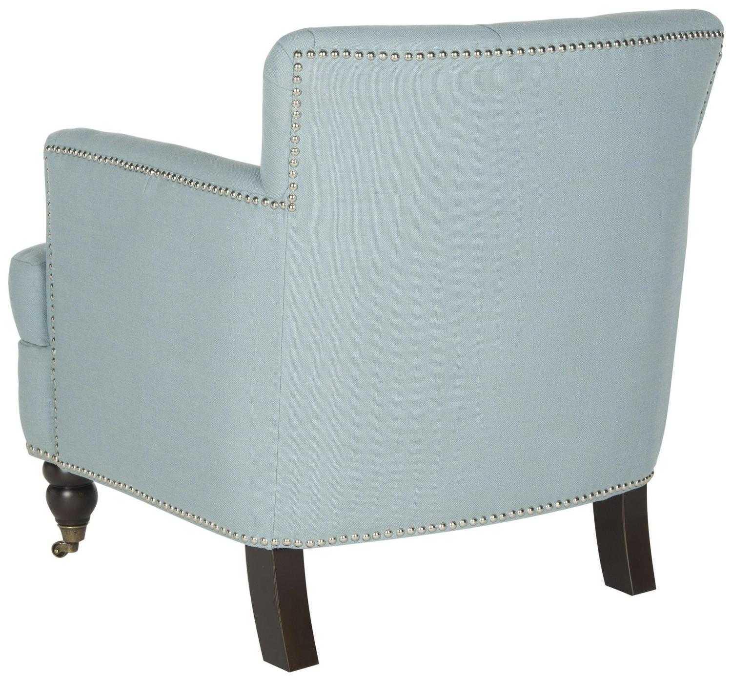 Evoking classic elegance, the Colin club chair in sky blue linen upholstery is a timeless design that complements traditional and transitional furnishings. Inviting in the living room and cozy in the bedroom, Colin is crafted with plush seat cushion, and designer details from button tufting to brass nail head trim and birch wood legs finished in cherry mahogany.