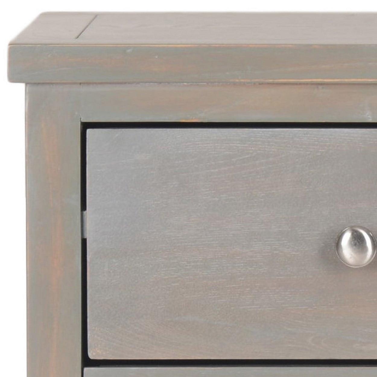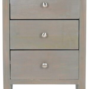 Get organized in style with the Deniz nightstand, a transitional design in sturdy elm wood with a fashionable French grey finish. With three roomy drawers, this piece is ideal as a bedroom nightstand, but equally good looking as an accent table in the living room or office. This piece is styled to coordinate with casual, country and soft contemporary furnishings.