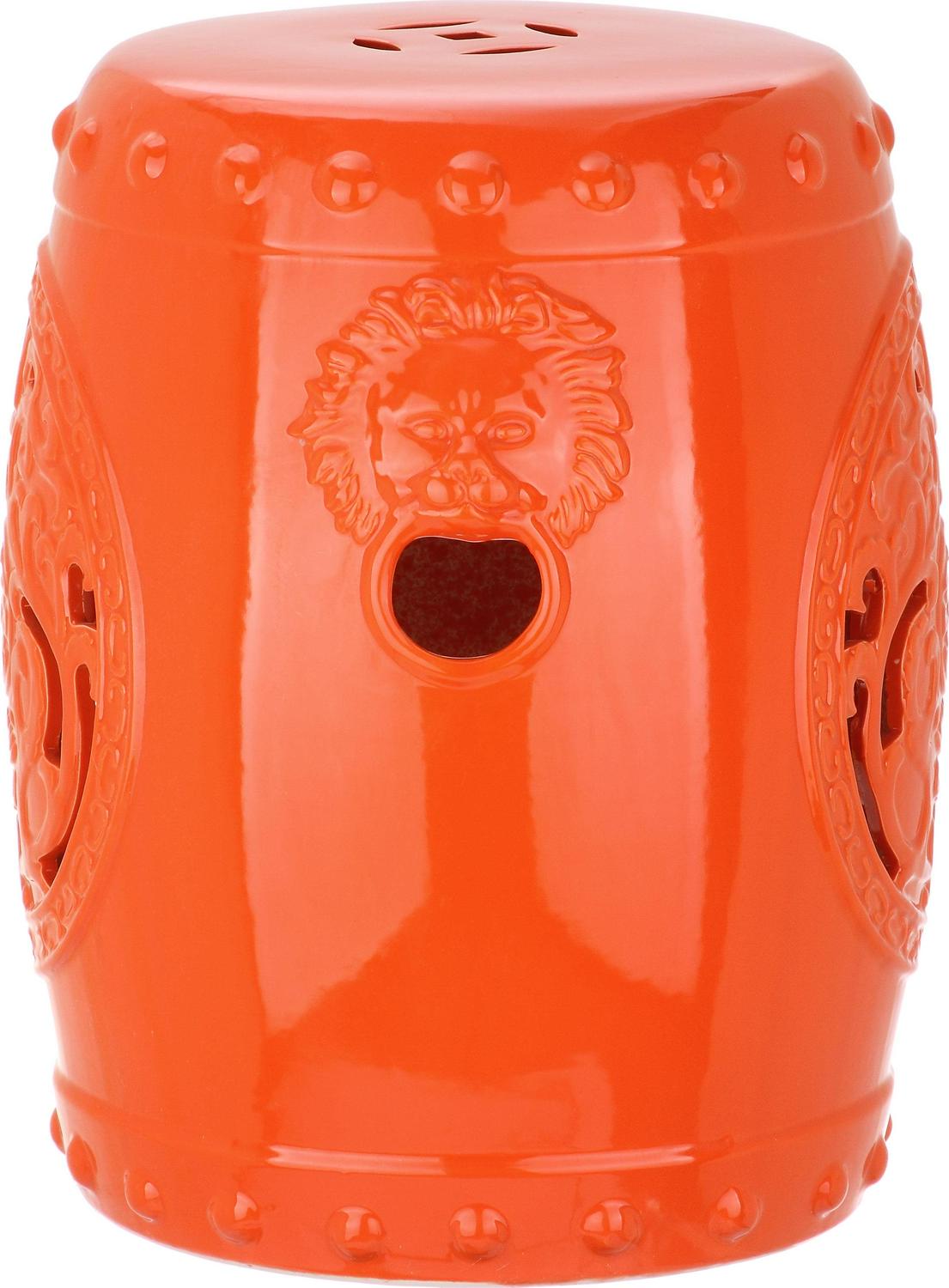 World travelers will appreciate the intricately sculpted east-meets-west glazed ceramic Dragon Coin garden stool. The orange indoor-outdoor stool is adorned with Chinese vessel nailheads, lucky coin top, a pierced medallion and Roman lion heads.