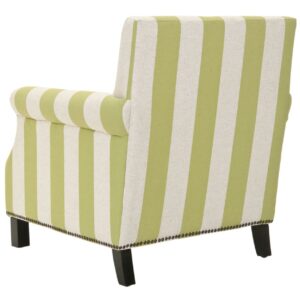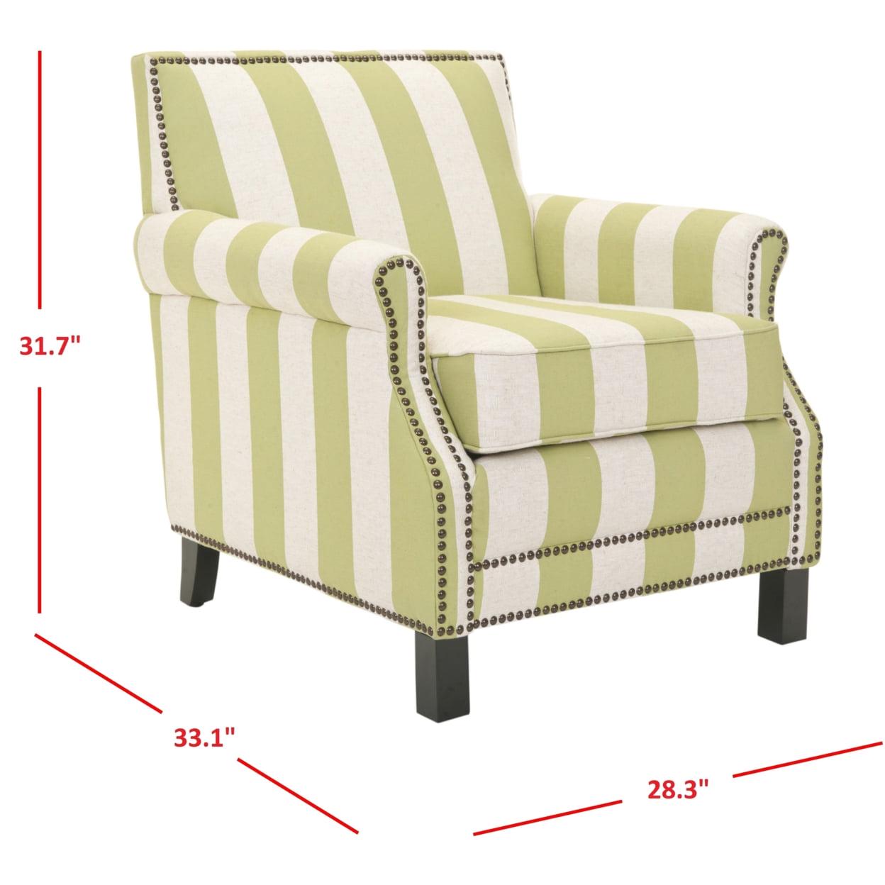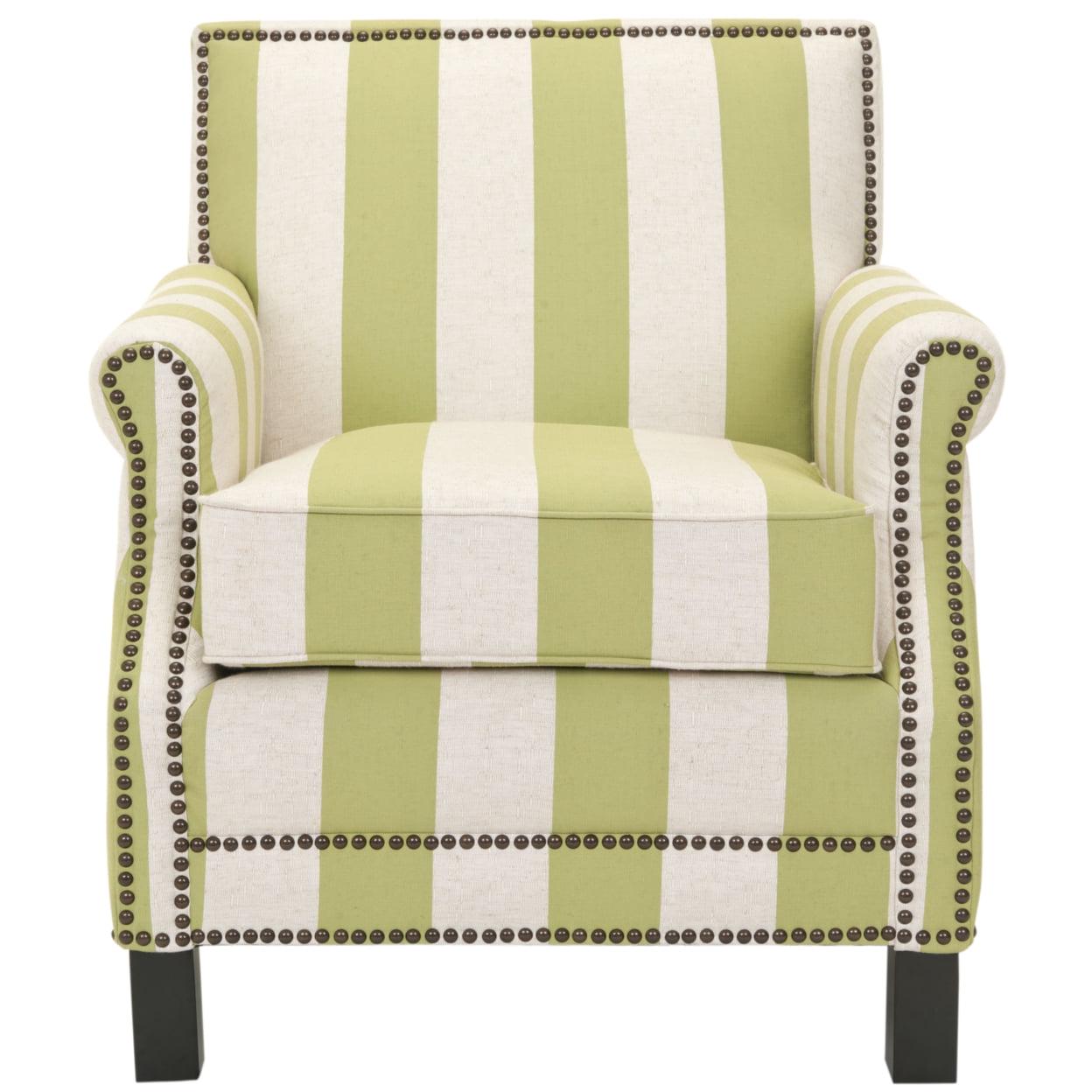 SAFAVIEH Easton Club Chair With Stripes Brass Nail Head Green / White The distinguished Easton Chair is a fireside classic, featuring a slender frame, roll arms, and brass nail head details. Upholstered in a striped linen blend, Easton stands on birch wood legs in espresso, making for an easy going version of the library favorite. Designed for small spaces, Easton adapts to traditional, country, and contemporary settings with ease.