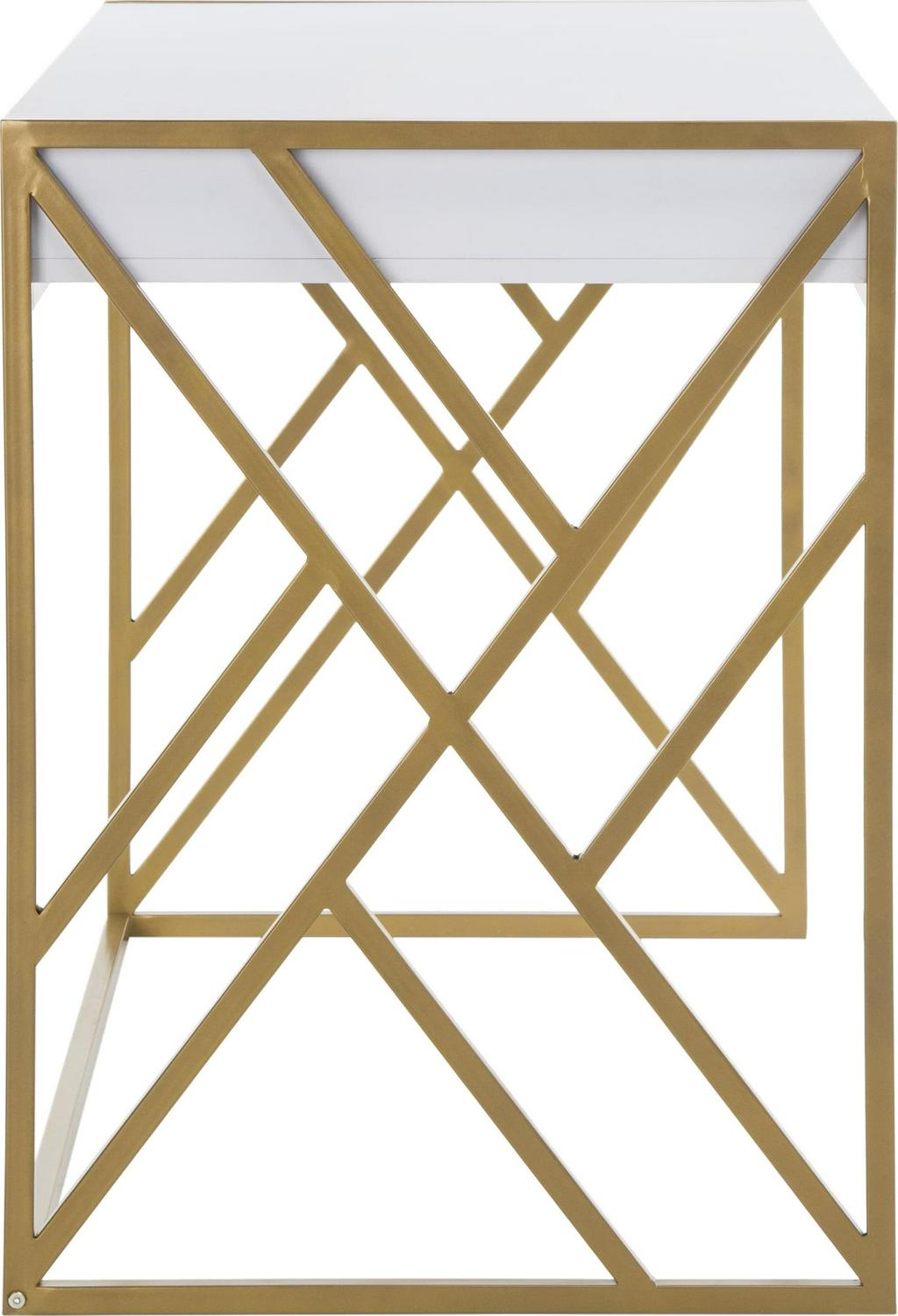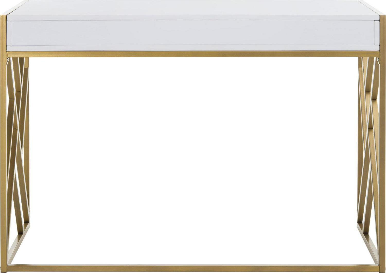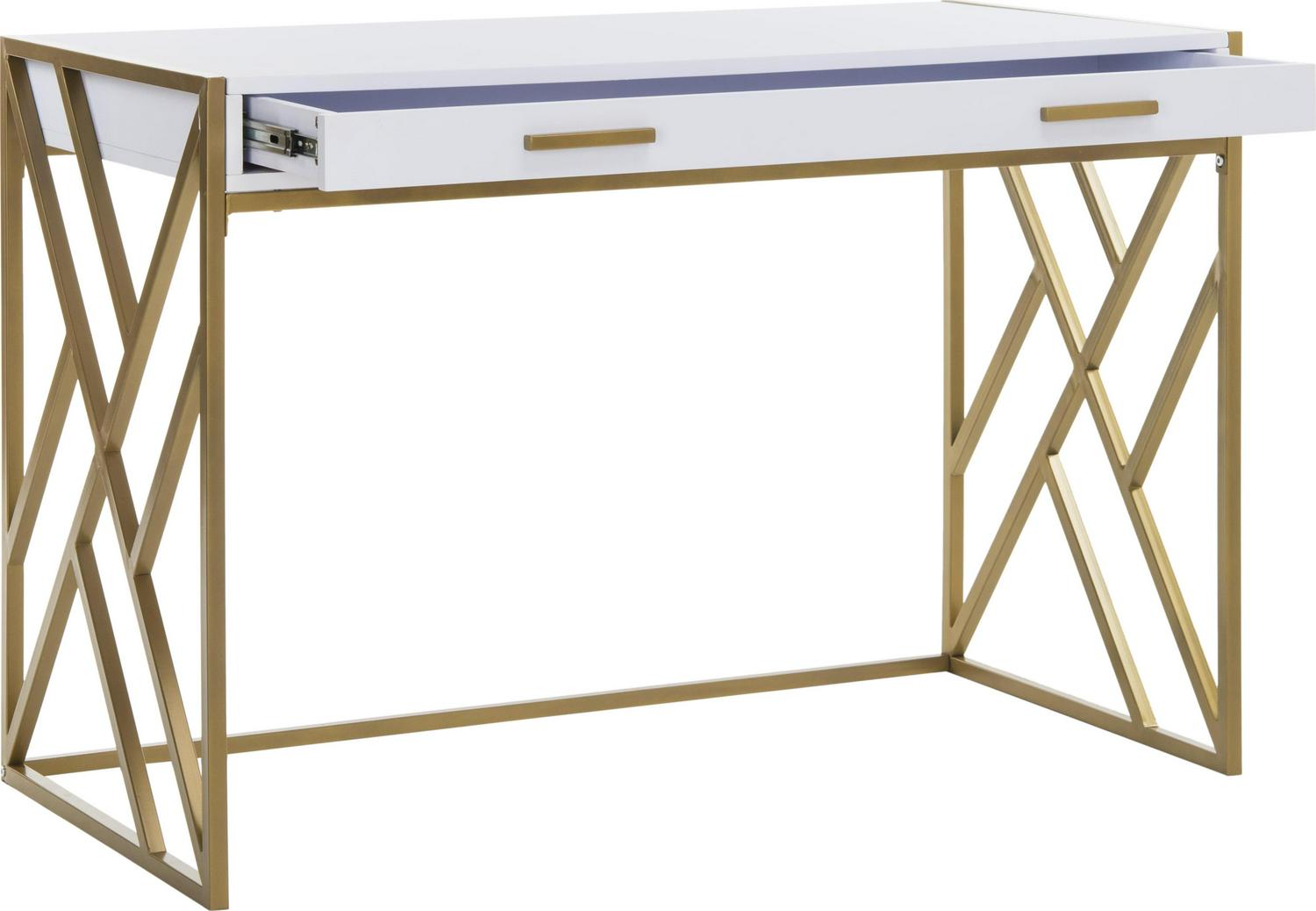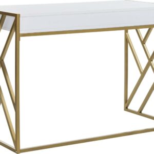 An instant promotion for any office design, this contemporary 1-drawer desk brings style and substance to the workplace. Its sleek white finish is paired with a sculptural geometric frame finished in luxurious gold. Ample drawers ensure organization.