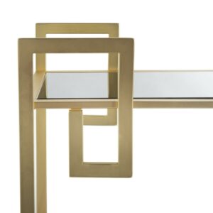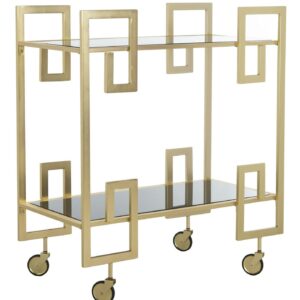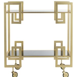A contemporary classic, this 2-tier bar cart was designed to add modern luxury to any room. Its timeless Greek key design is highlighted with a rich brass finish while its chic black glass tiers graciously display glassware, beverages and culinary treats.