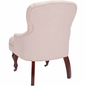 Charming in every designer detail, the petite Falcon arm chair recalls richly upholstered parlor and boudoir chairs from a gentler bygone era. Replete with traditional details, Falcon is updated with biscuit tufted pure linen upholstery in fashionable taupe, and features sloped arms. Birch wood spindle legs are finished in cherry mahogany and come with front casters for easy mobility.