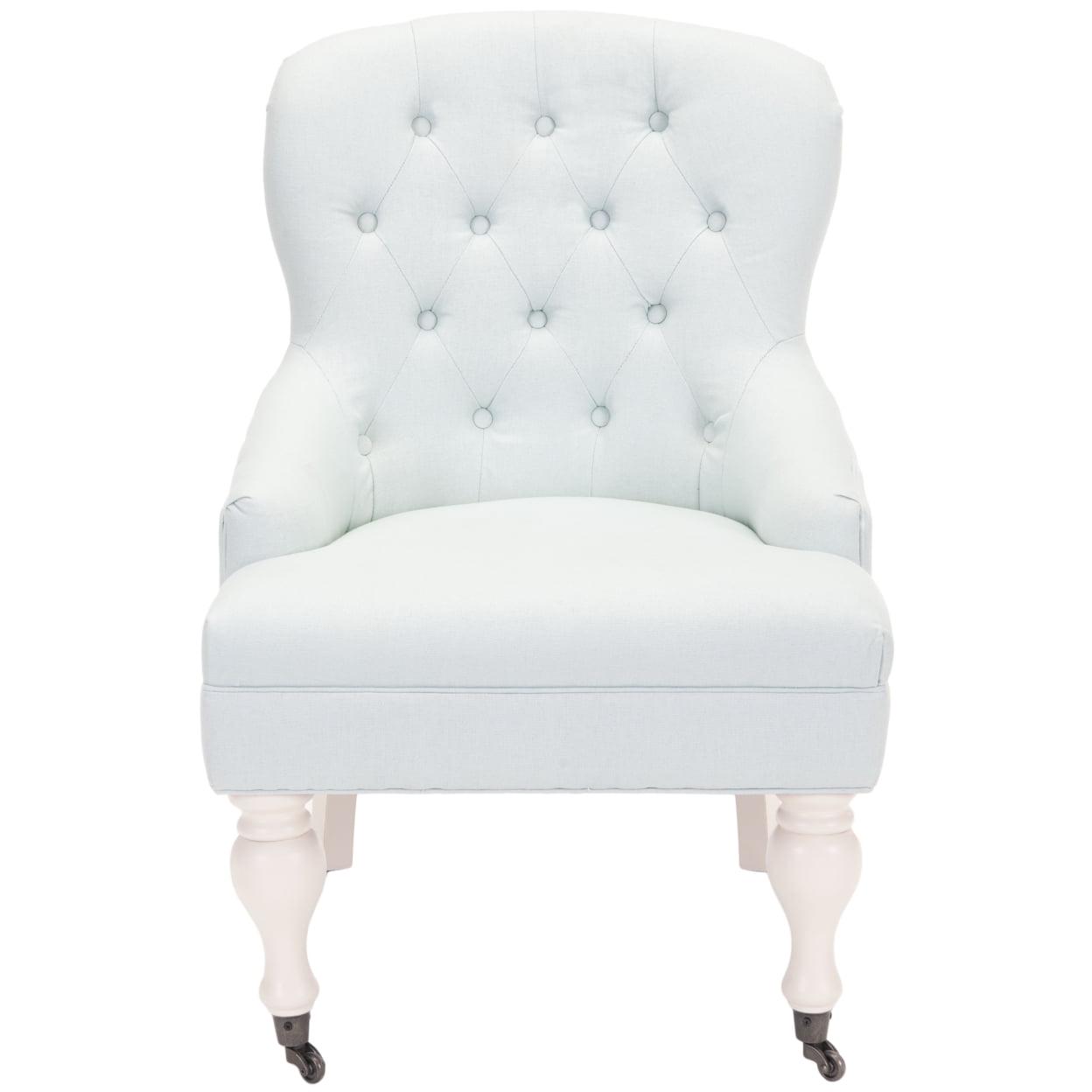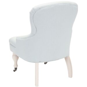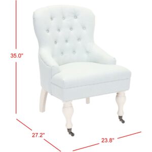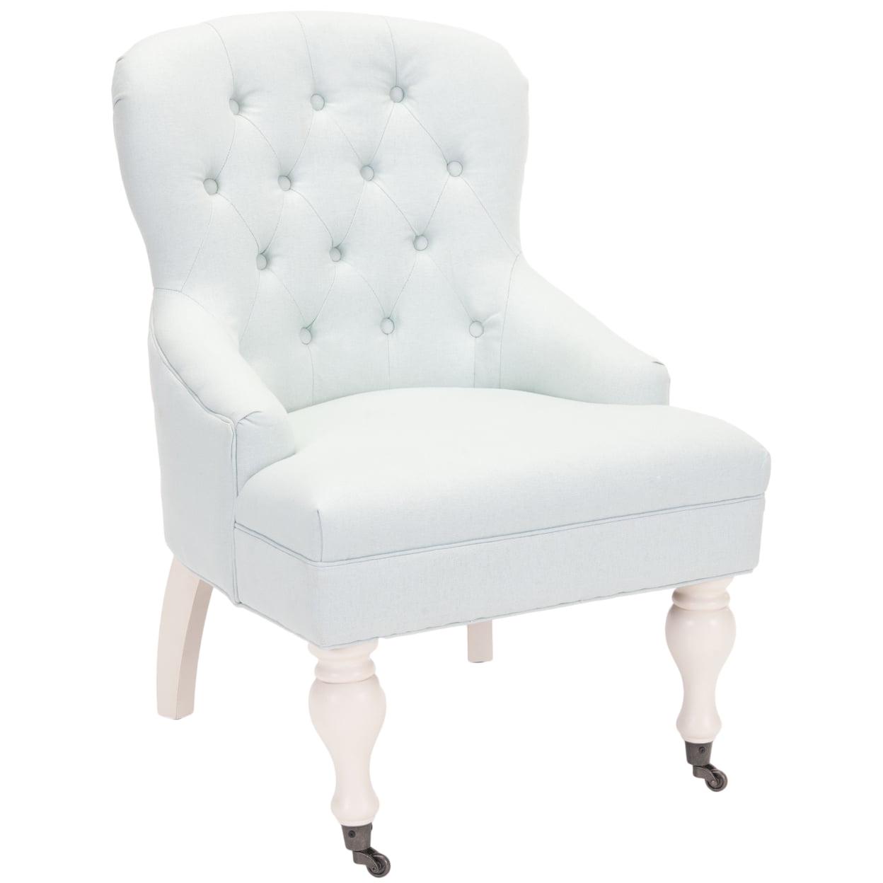 SAFAVIEH Falcon Tufted Arm Chair Robins Egg Blue Charming in every designer detail, the petite Falcon Arm Chair recalls rich parlor chairs from a gentler bygone era. Replete with traditional details, Falcon is updated with diamond tufted robins egg blue linen cotton blend and subtle sloped arms. Birch wood legs are finished in ivory with front casters for easy mobility.