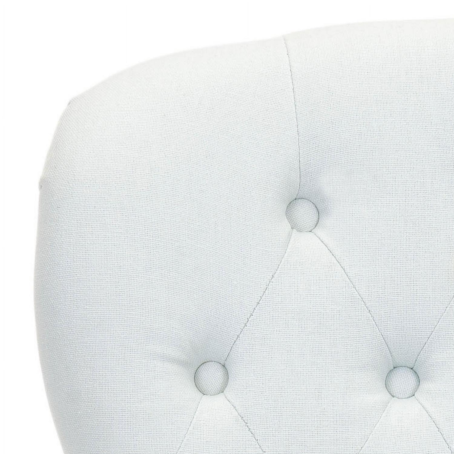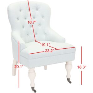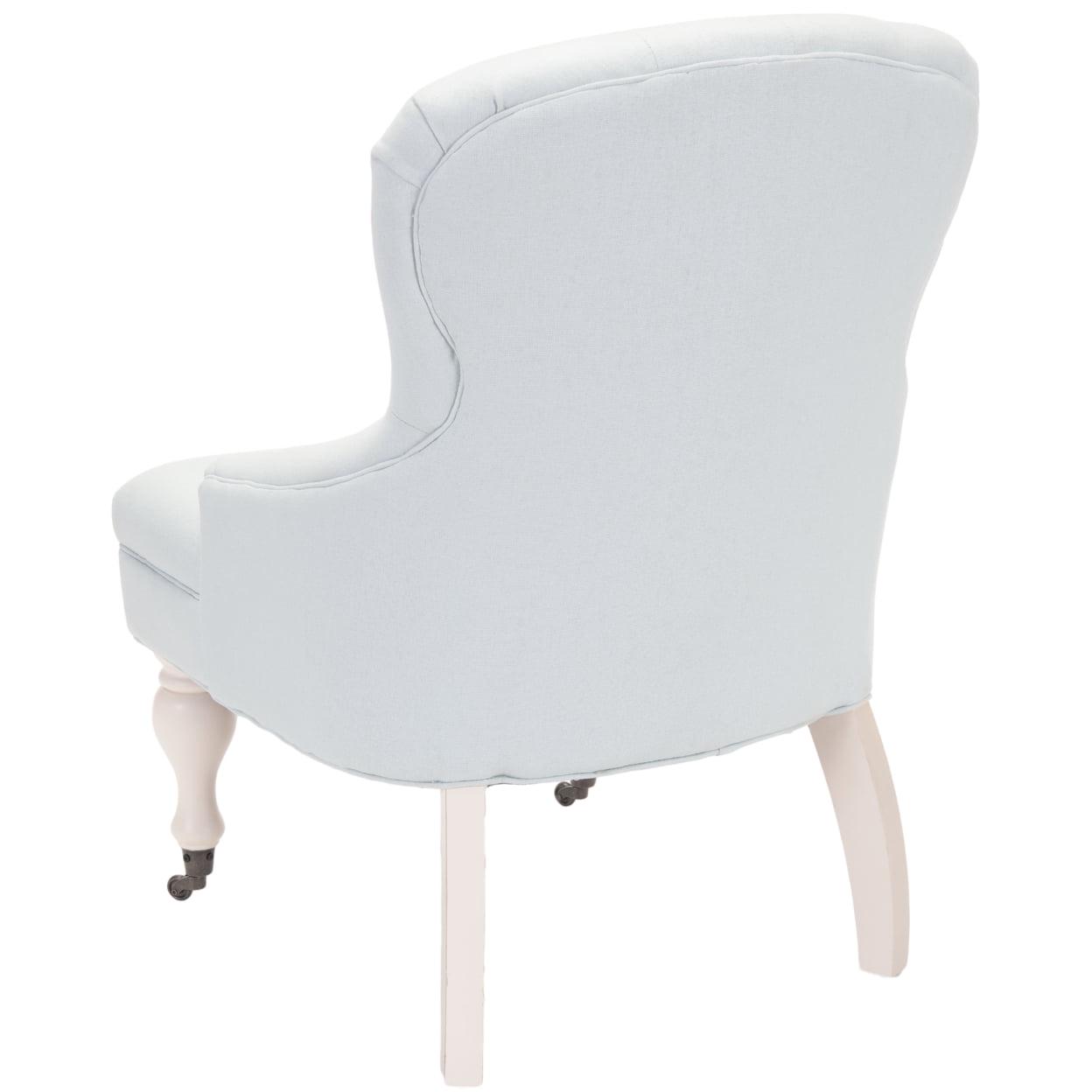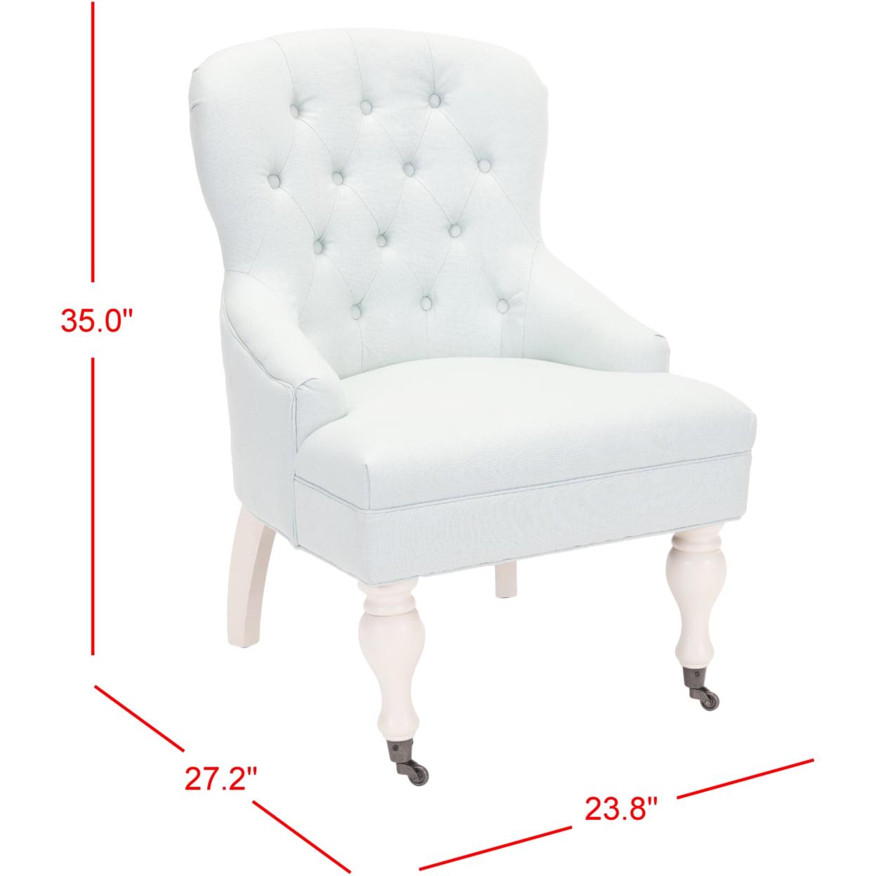 SAFAVIEH Falcon Tufted Arm Chair Robins Egg Blue Charming in every designer detail, the petite Falcon Arm Chair recalls rich parlor chairs from a gentler bygone era. Replete with traditional details, Falcon is updated with diamond tufted robins egg blue linen cotton blend and subtle sloped arms. Birch wood legs are finished in ivory with front casters for easy mobility.