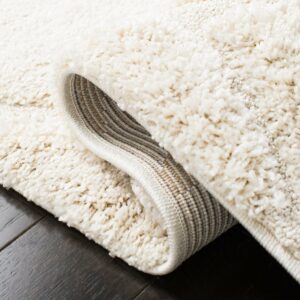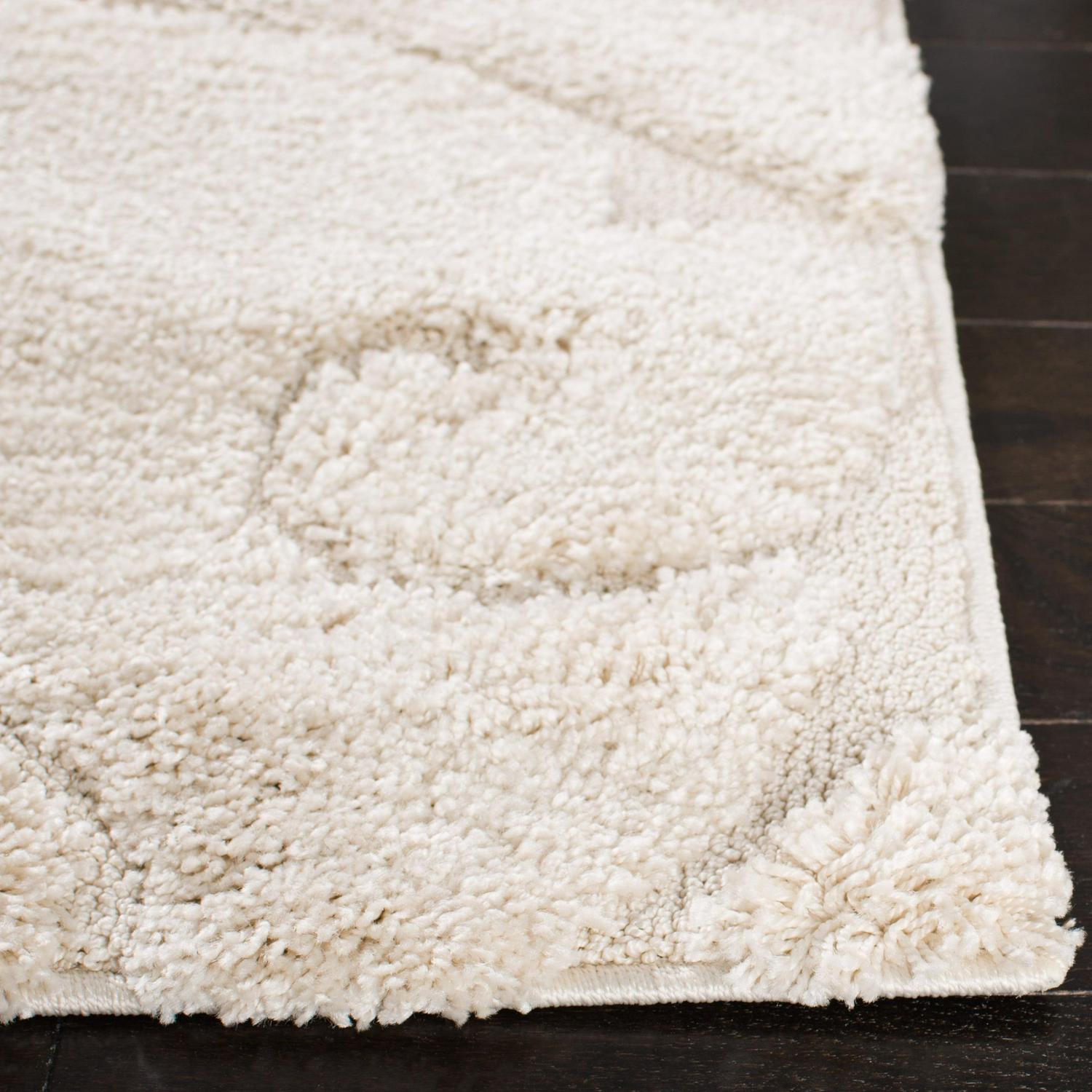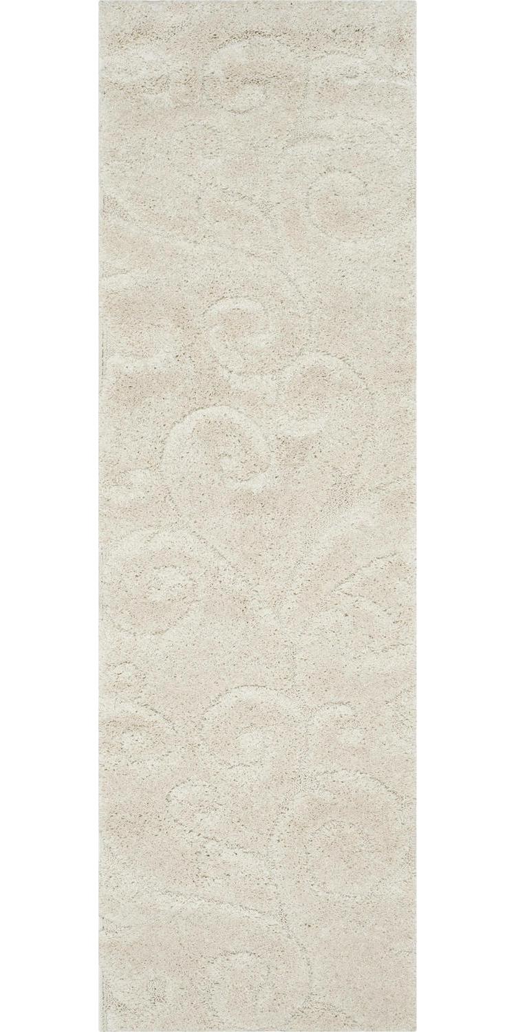 Florida Shag Rug Collection. Plush And Dense Pile Perfect For Living And Bedroom Décor. This Safavieh Florida shag captures the laid-back lifestyle of the southern peninsula in an ultra-soft, crème tone-on-tone floor covering. A sculpted high-low pile accentuates the detailed damask vine designs for rich textural dimension highlighted over the smooth crème background. Constructed using power-loomed synthetic yarns for a durable, casual shag carpet that will retains vivid color and striking texture for years to come.