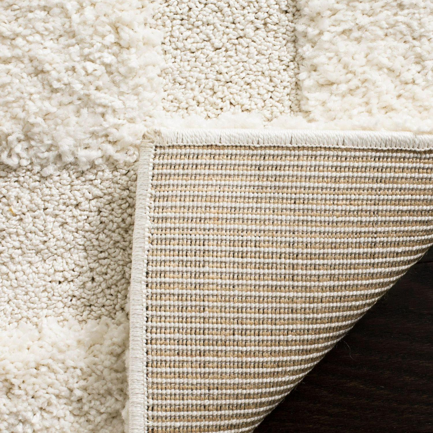 This Florida shag by Safavieh revives the traditional look of shag carpets with engraved motifs on a plush, raised pile. Colored in solid crème, the distinct high-low synthetic fiber pile uses elevated layers to emphasize concentric rectangles for visually striking floor décor. Wonderfully styled for contemporary or classy country home furnishings.