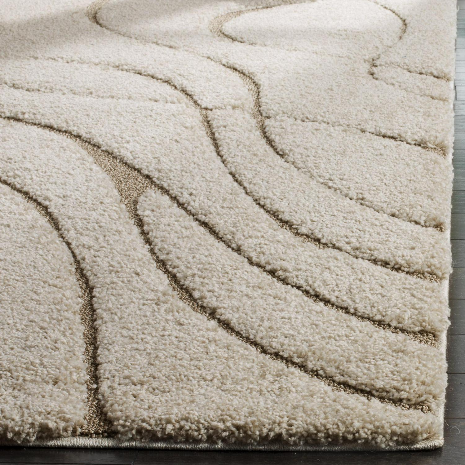 Shag Rug Collection. Plush And Dense Pile Perfect For Living And Bedroom Décor. This Safavieh Shag Area Rug captures the laid-back lifestyle of the southern peninsula in an ultra-soft, crème tone-on-tone floor covering. A sculpted high-low pile accentuates the detailed damask vine designs for rich textural dimension. Constructed using power-loomed synthetic yarns for a durable, casual shag carpet that will retains vivid color and striking texture for years to come. Elegantly designed, each rug provides comfort and luxury to complement your style. Durably construction, these shag rugs are the perfect addition in your home for a chic upgrade.