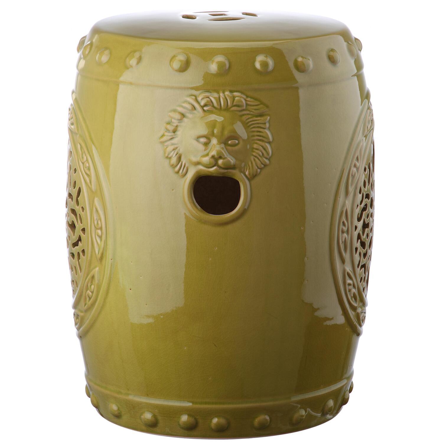 Global influences abound in the spring green glazed ceramic Flower Drum indoor-outdoor garden stool. Classic Chinese vessel nailheads and lucky coin top motif contrast Roman lion head sculptures and a pierced medallion in this elegant piece.