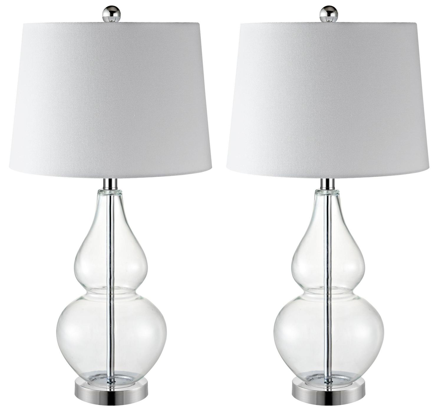 SAFAVIEH Frena Table Lamp (Set of 2) | Clear | Bold and beautiful, this contemporary table lamp adds drama to any interior with its brilliant burst of color. Its sinuous glass curves are adorned with a dynamic blue hue that radiates alongside its polished chrome base and complementary white shade. Sold in sets of two. Begin your rug, furniture, lighting, outdoor, and home decor search and discover over 100,000 SAFAVIEH products today.