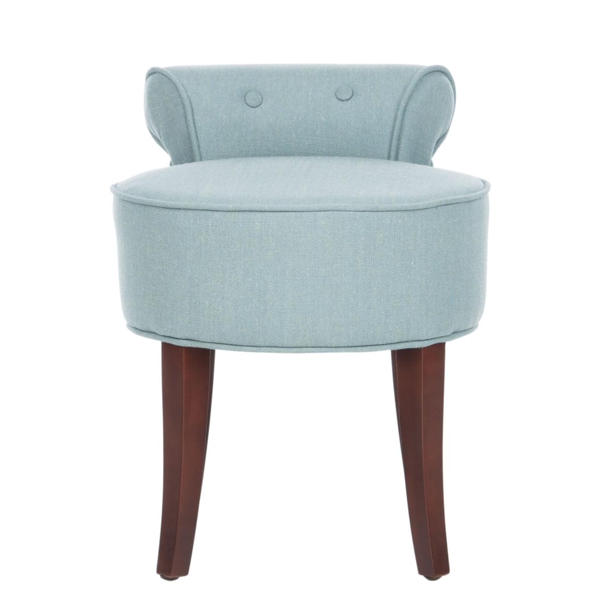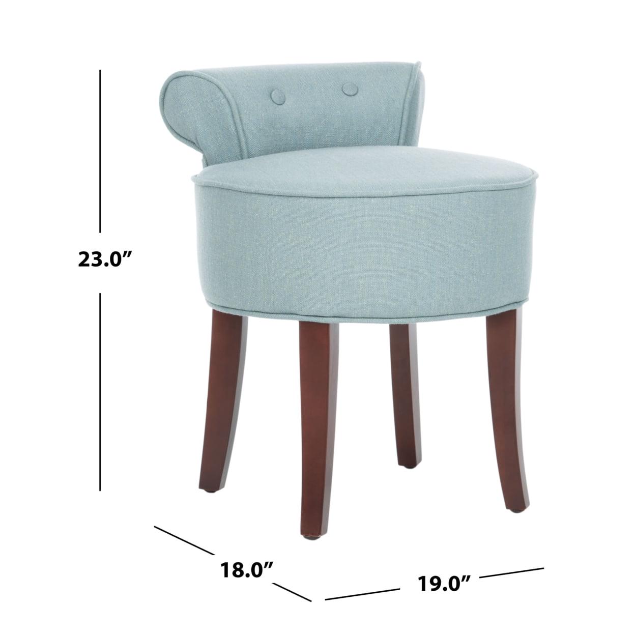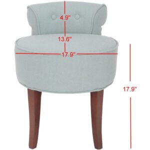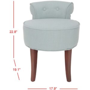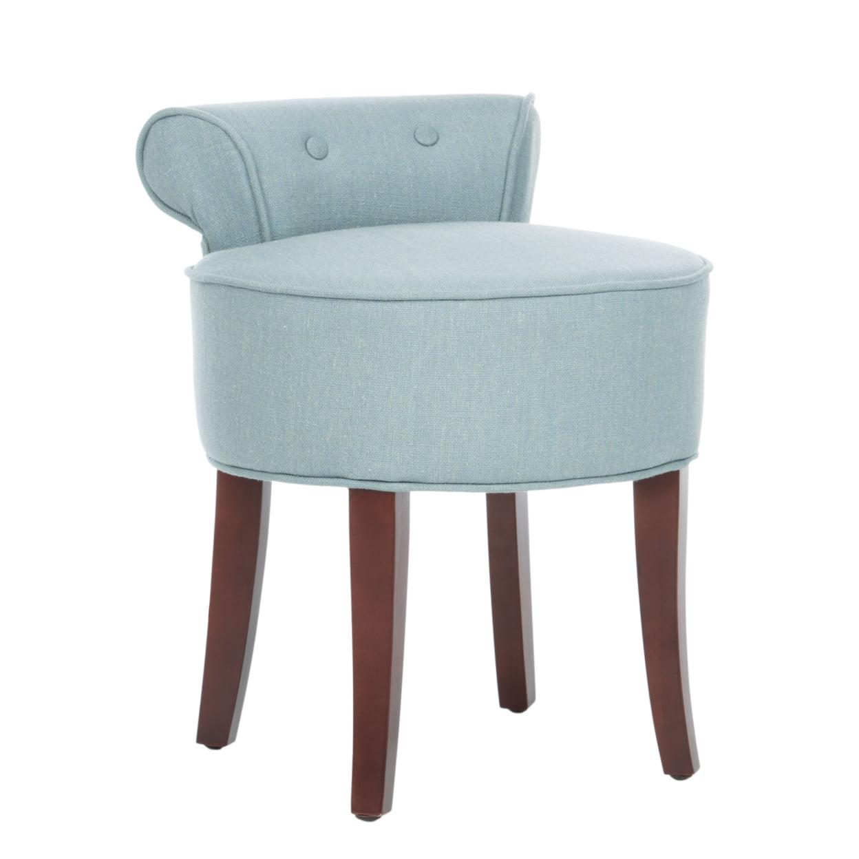 SAFAVIEH Georgia Vanity Stool Silver Blue / Cherry Mahogany The adorable Georgia vanity chair is petite enough to tuck in a bathroom or bedroom, and brimming with feminine style. Graceful cherry mahogany toned birch wood legs, deep seat and diminutive button tufted back are designed for indulgent comfort. Upholstered with silver blue polyester/viscose blend fabric with self welting for a decorator touch.