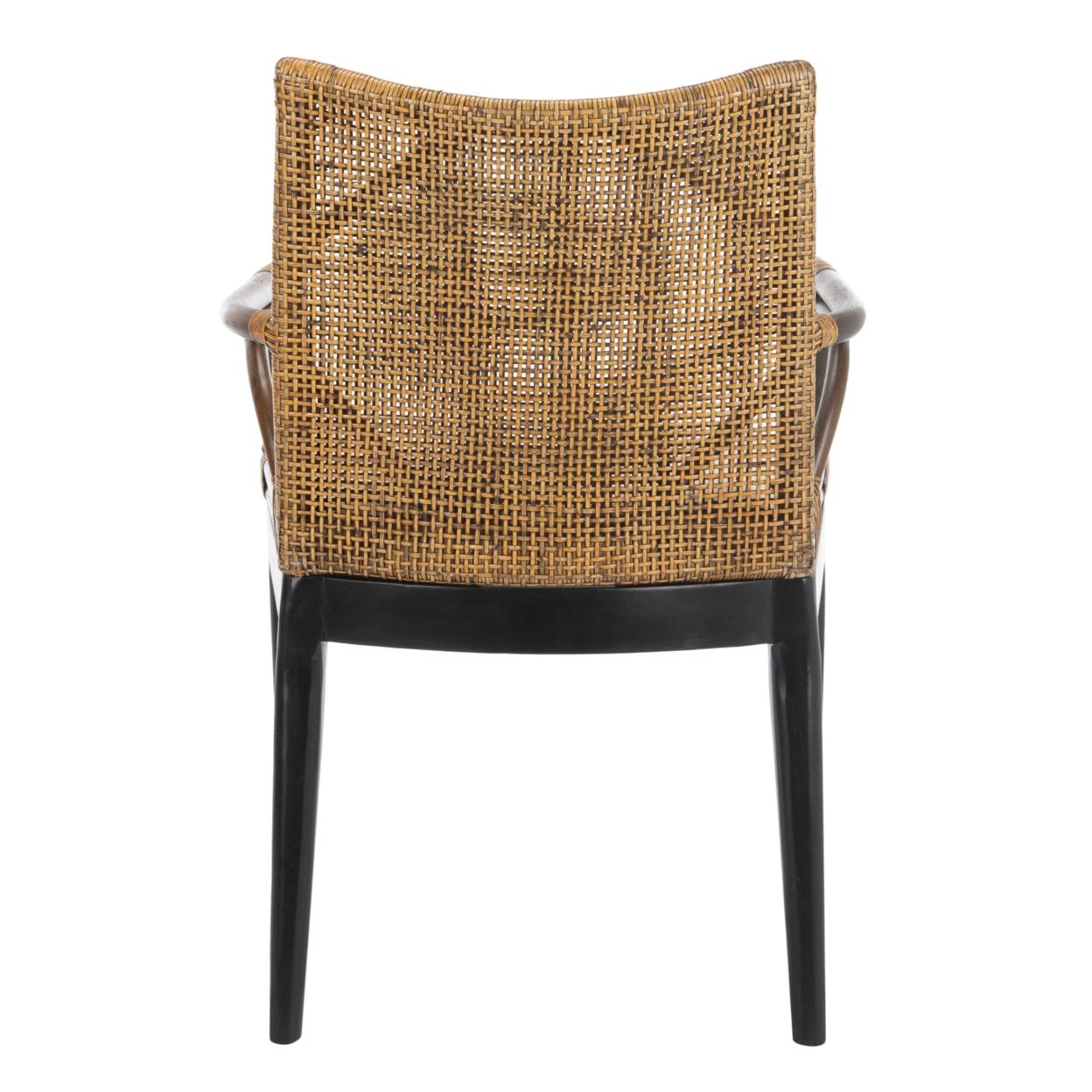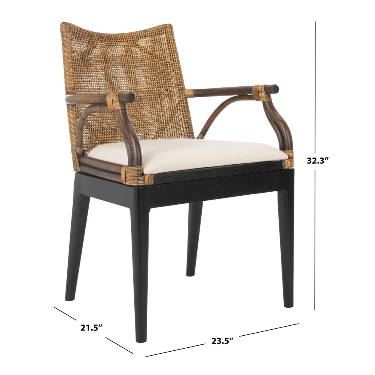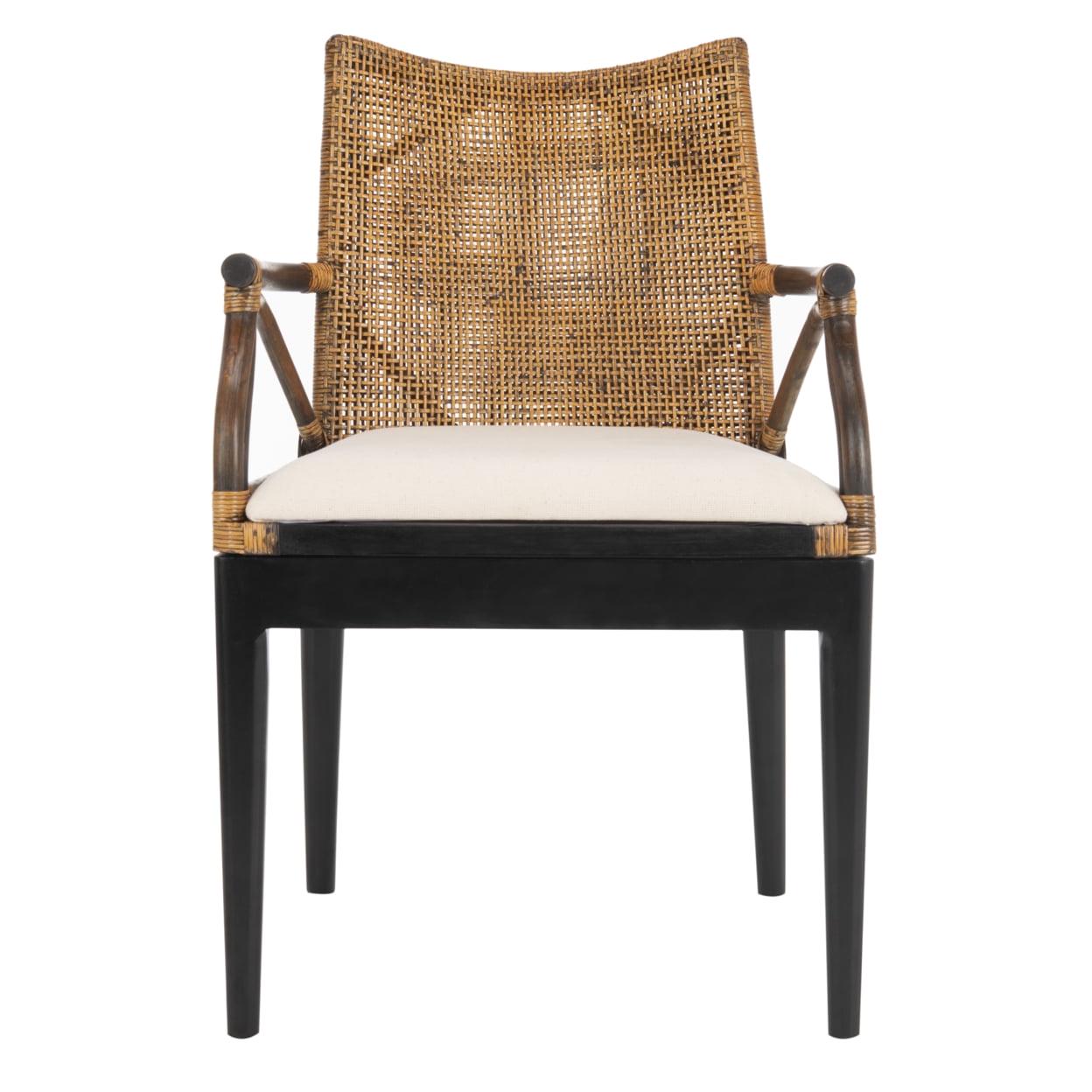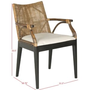 SAFAVIEH Gianni Arm Chair Brown / Black A contemporary take on British Colonial style, this Gianni Arm Chair revitalizes classic forms for today s coastal chic interiors. Brown woven rattan and bamboo inspired open arms are fabulously offset by sleek black mahogany legs and smooth white cushion, giving Gianni a breezy, tropical feel.