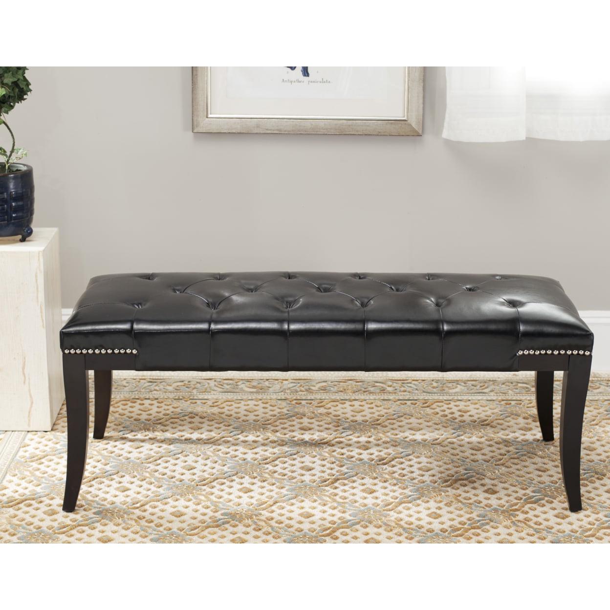 SAFAVIEH Gibbons Bench Silver Nail Head Black Luxurious at the foot of a bed or topped with a tray for use as a living room table, the Gibbons Bench is a contemporary designer classic. Black leather is contrasted with espresso colored birch wood legs, and accented with elegant tufting and silver nail head trim.