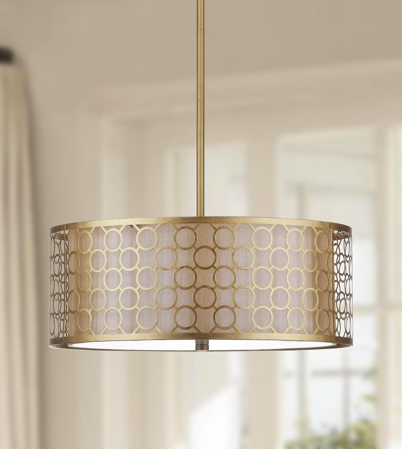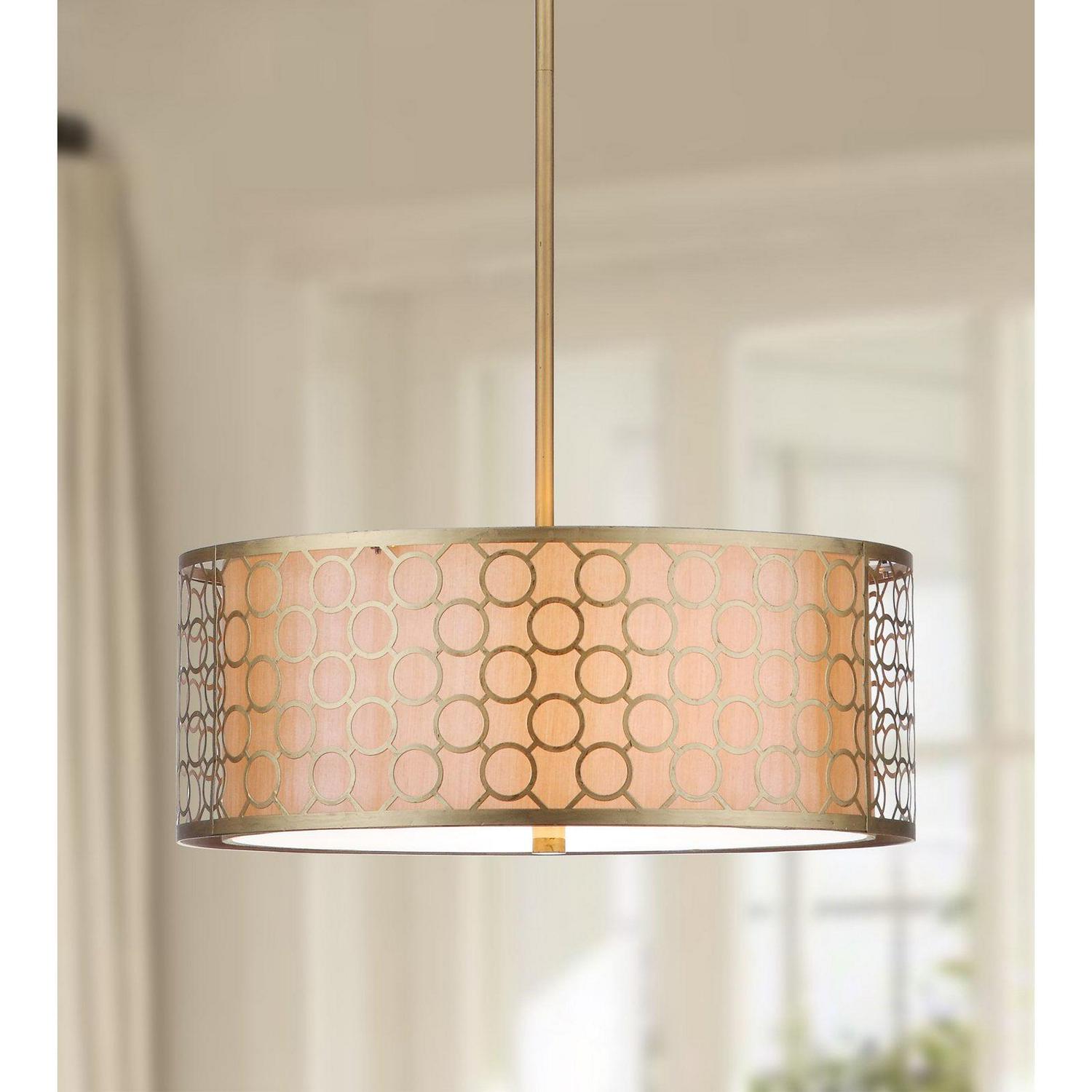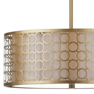 A distinctive marriage of a cream fabric shade with geometric-patterned laser cut steel in antique gold finish, the Giotta drum pendant light showcases the glamorous shade-within-a-shade trend. Giotta brings a romantic play of light to transitional rooms. This lighting serves as the perfect addition to your home.- Contemporary design adds a chic look to your home