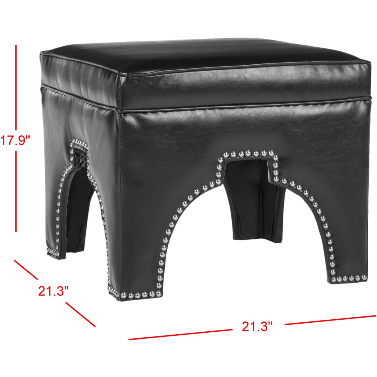 SAFAVIEH Grant Faux Leather Ottoman Silver Nail Head Black Rest your feet on the globally inspired Grant Ottoman, beautifully combining a classic Mediterranean architectural arch with glam silver nail head. Upholstered in chic black bicast leather, Grant is equally good looking alone or in pairs in the living room, family room, or bedroom.