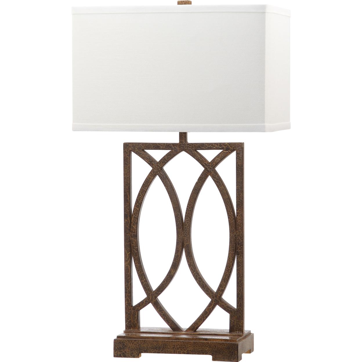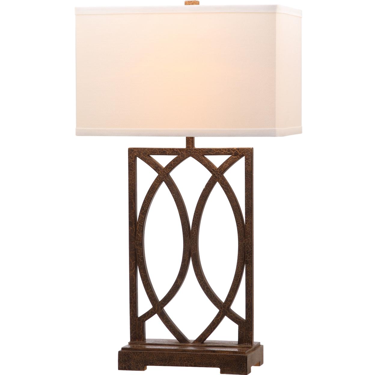 SAFAVIEH Jago Table Lamp (Set of 2) | Antique Brown | Artfully crafted of interlocking arcs of antique bronze metal, the set of two Jago table lamps is ideal for transitional rooms. The chic new rectangular lines of a crisp white texted cotton shade contrast a graceful base with old world crackle finish. Begin your rug, furniture, lighting, outdoor, and home decor search and discover over 100,000 SAFAVIEH products today.