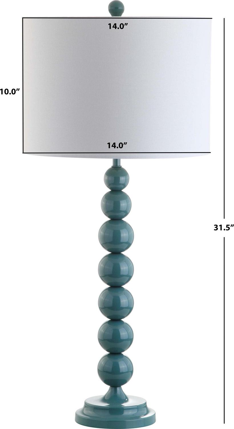 Light up your life with the perfect symmetry of this gleaming marine blue stacked ball lamp. The tall, lean silhouette adds height on a console or hall table and the uniform color of base, neck and final are complemented by the white cotton drum shade.
