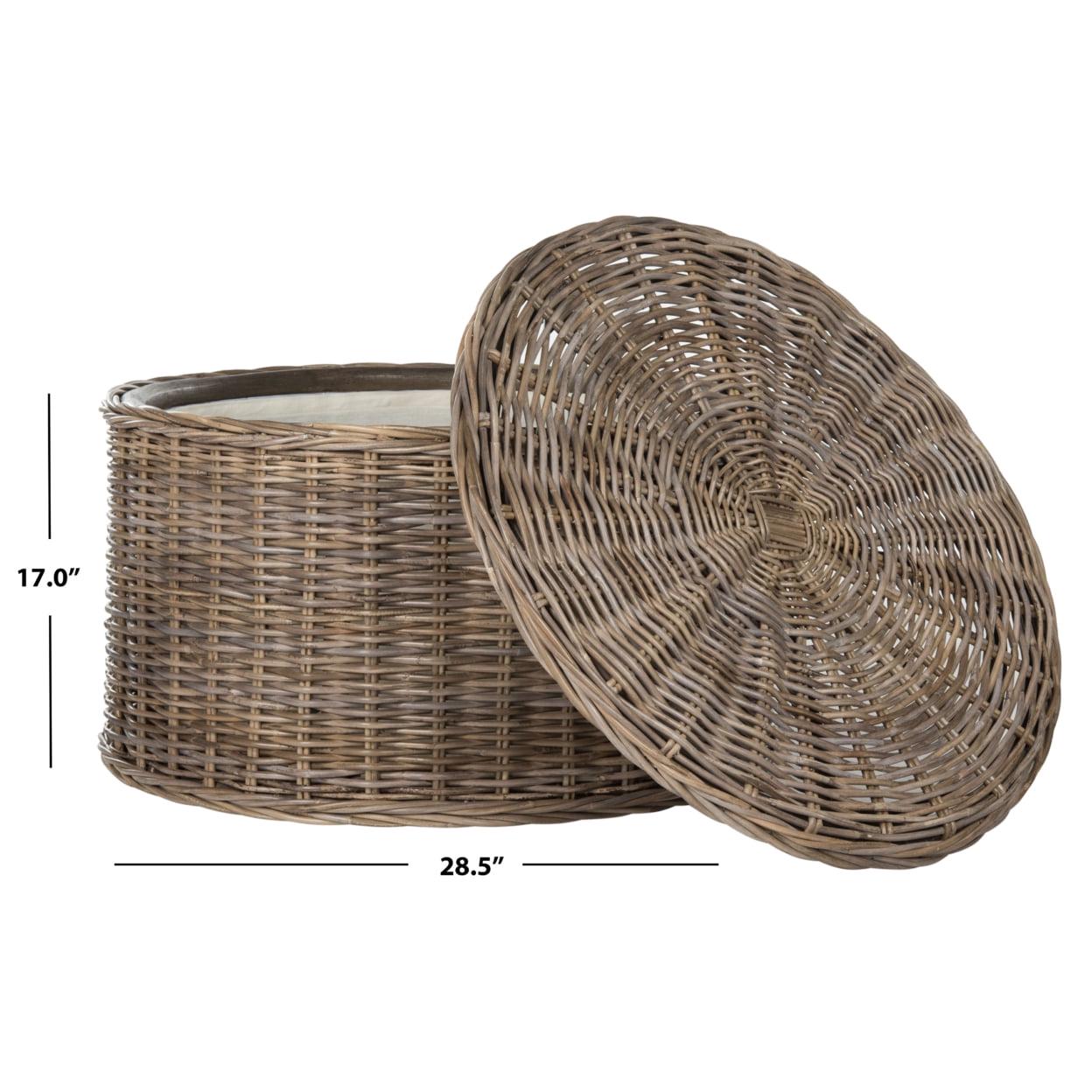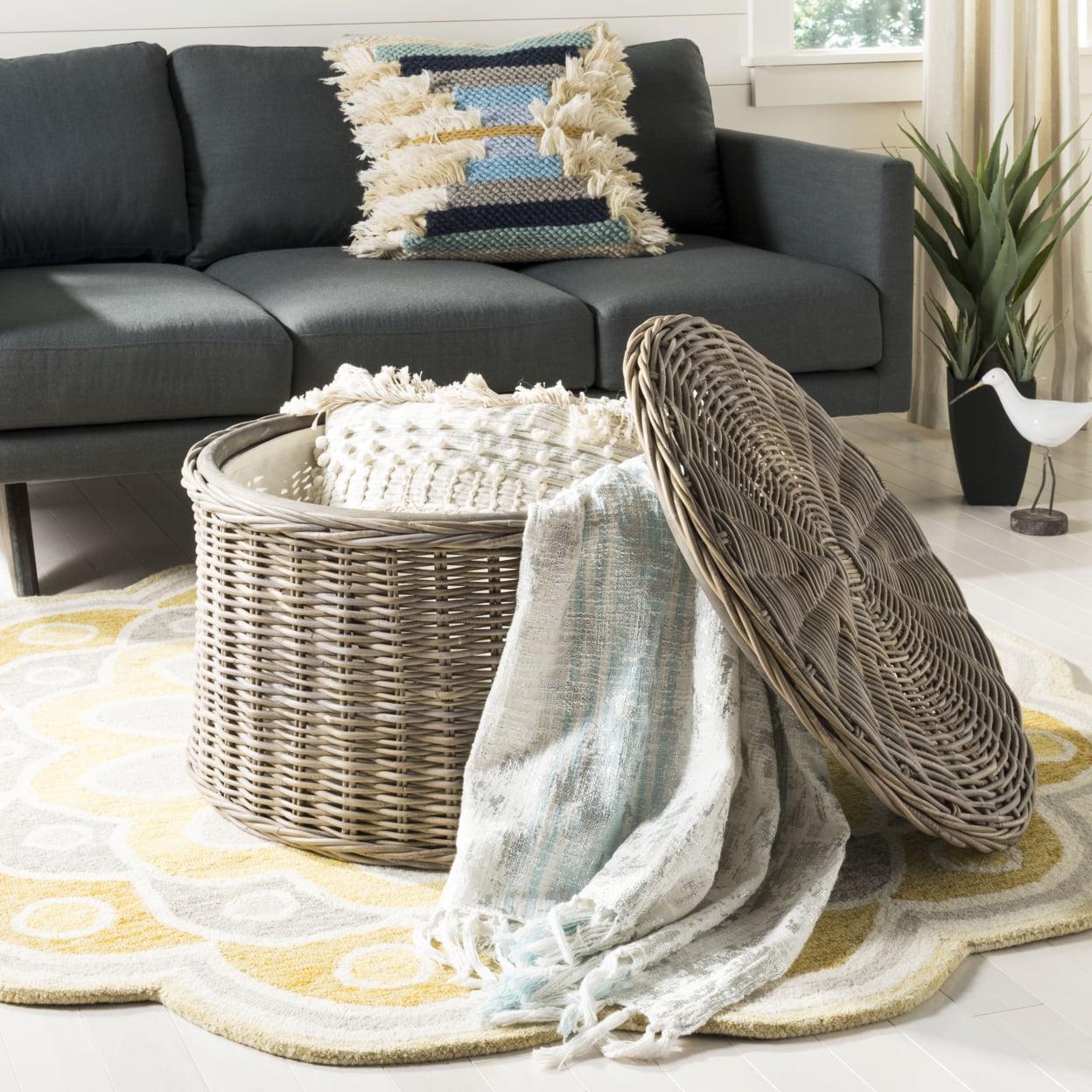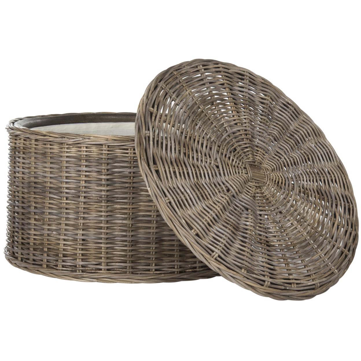SAFAVIEH Jesse Wicker Storage Coffee Table Grey Crafted with the natural beauty of kubu rattan, the contemporary storage coffee table is a balance of form and function. Its grey finish blends into any stylish space and its cotton lined interior ensures the elegant disappearance of life s accoutrements.