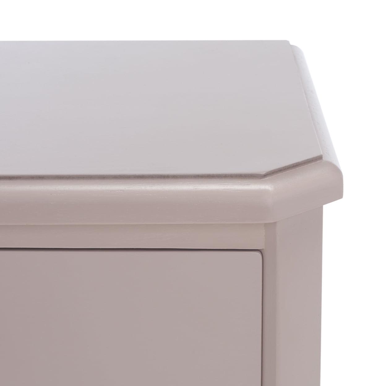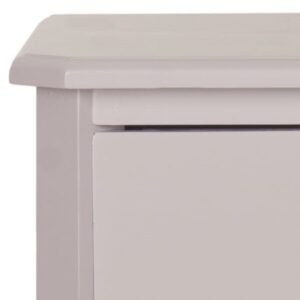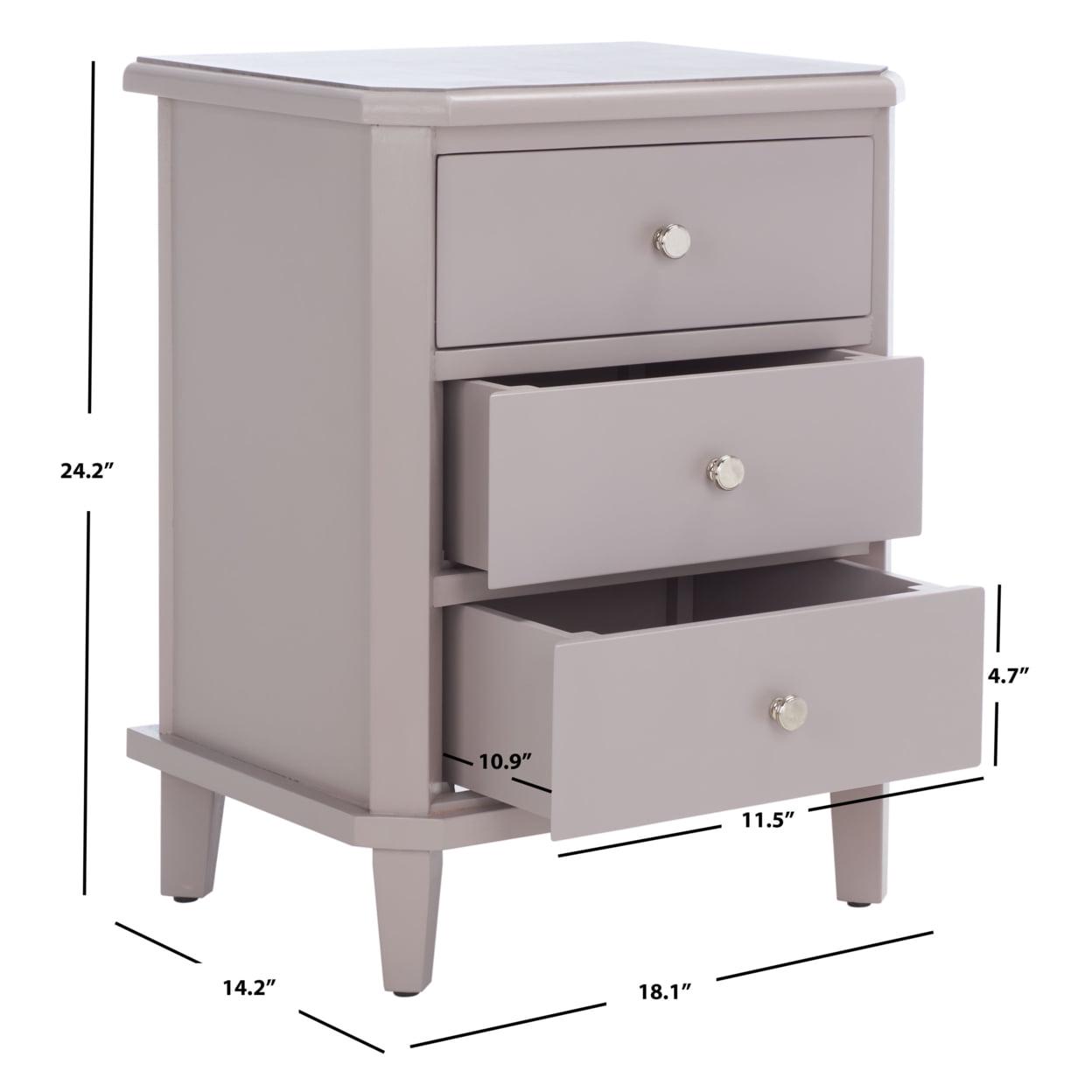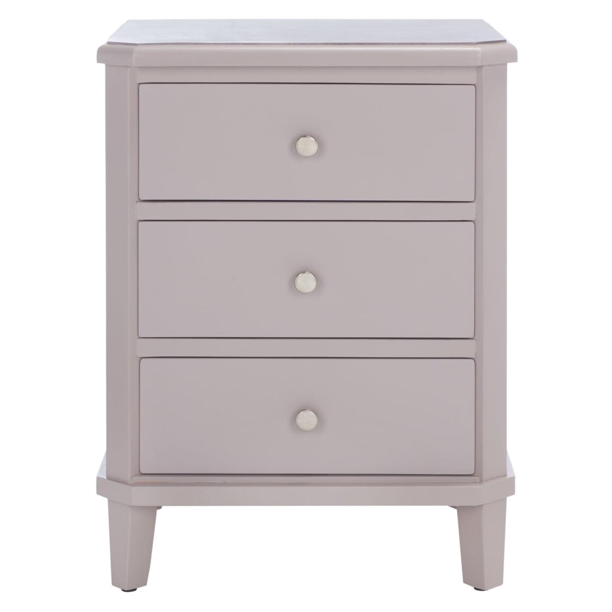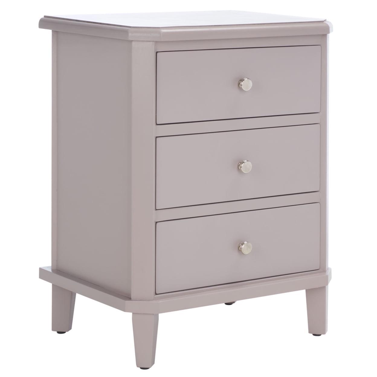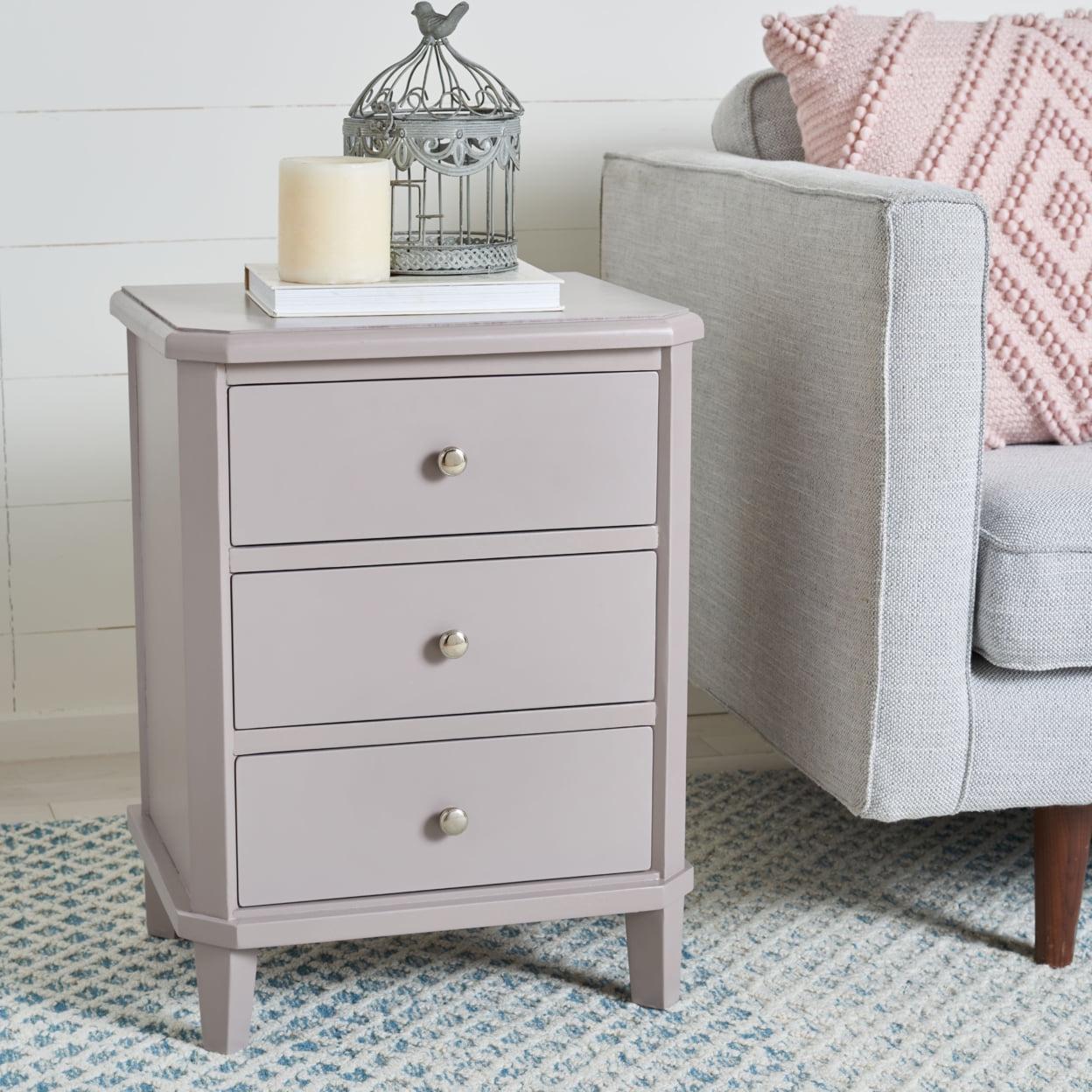SAFAVIEH Joe End Table With Storage Drawers Grey With its versatile transitional style, this Joe End Table is designed to complement any furnishings. Crafted of pine in a chic grey mauve, Joe has three ample drawers with polished silver pulls for precious objects and everyday essentials. Ideal for adding a touch of soft farmhouse flair to the living room or bedroom.