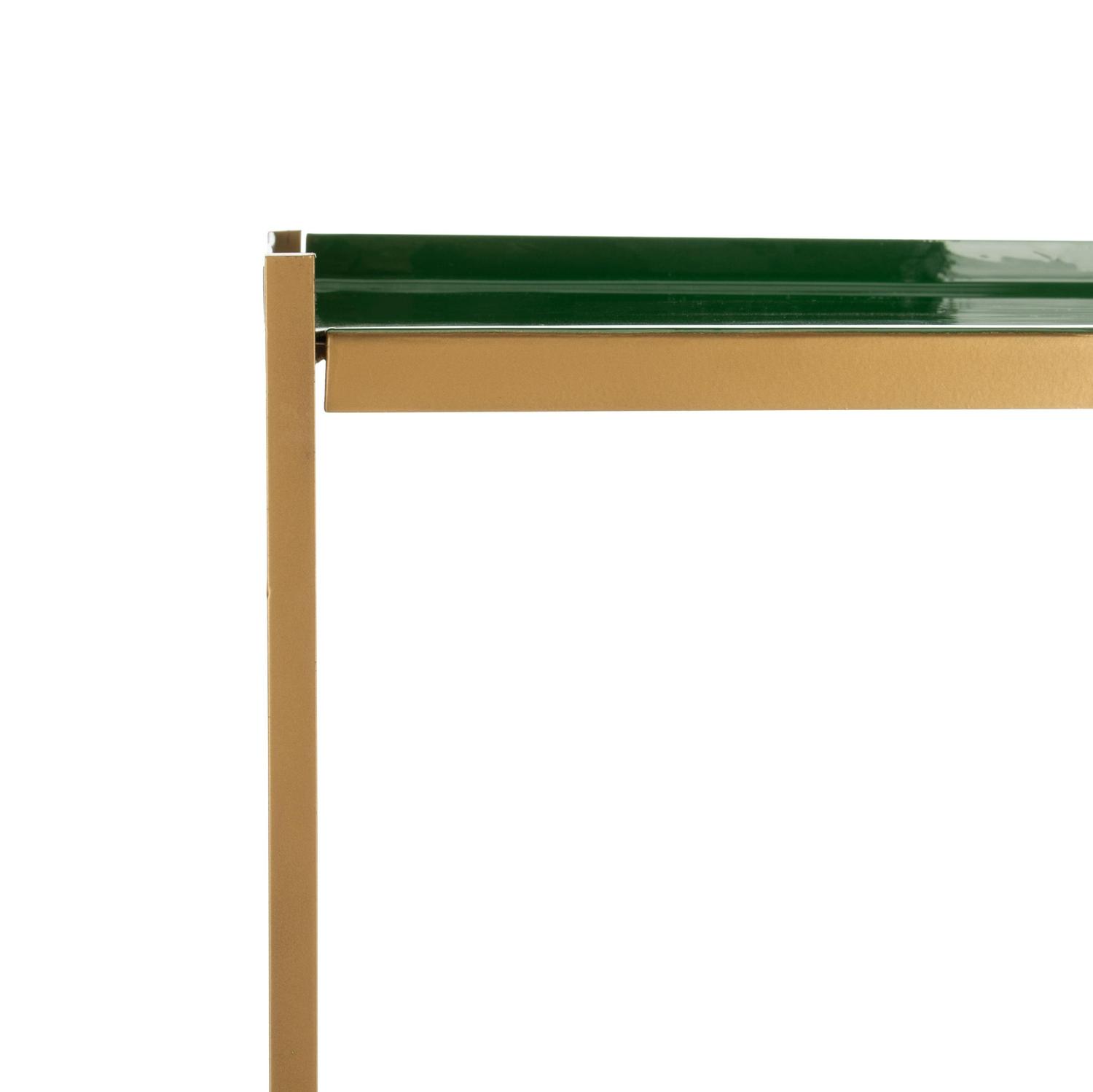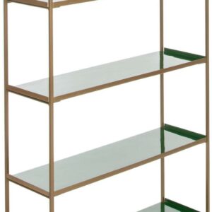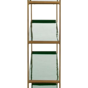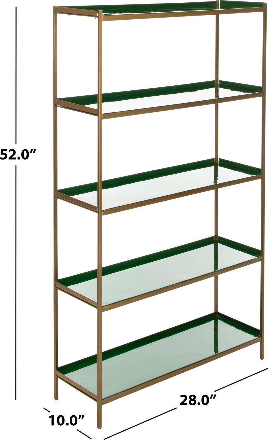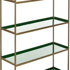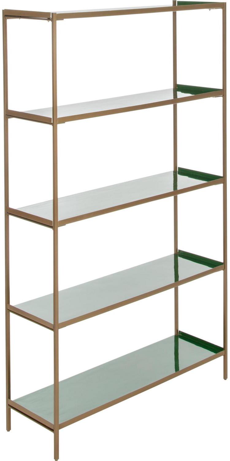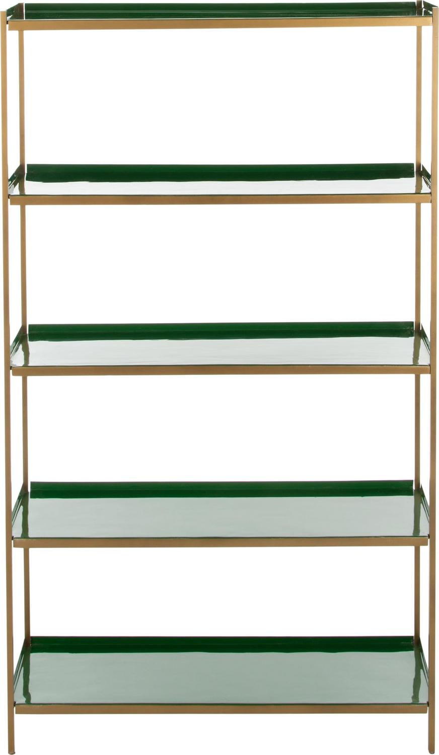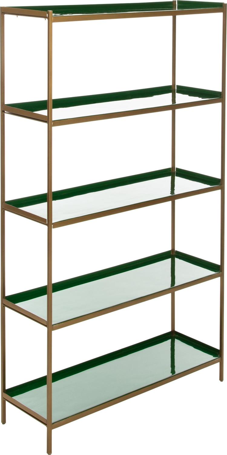 Tall, dark and handsome, this dramatic 5-tier étagère brings modern luxury to the living room. Its statuesque form was designed to blend style and substance with its sophisticated green shelves, sleek brass finish and generous layers of open storage.