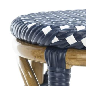Raise a glass to country and coastal decorating with the navy and white Kipnuk indoor-outdoor bar stool from Safavieh. A colorful addition to a kitchen or patio bar, the pretty Kipnuk is inspired by classic European bistro stools and crafted of white PE wicker and aluminum faux bamboo for easy care.