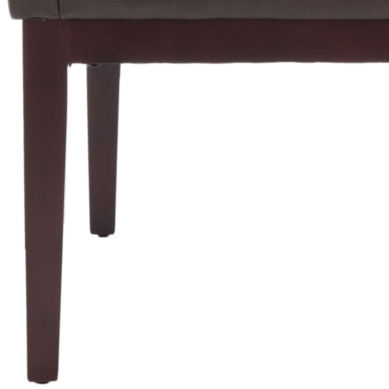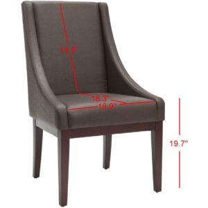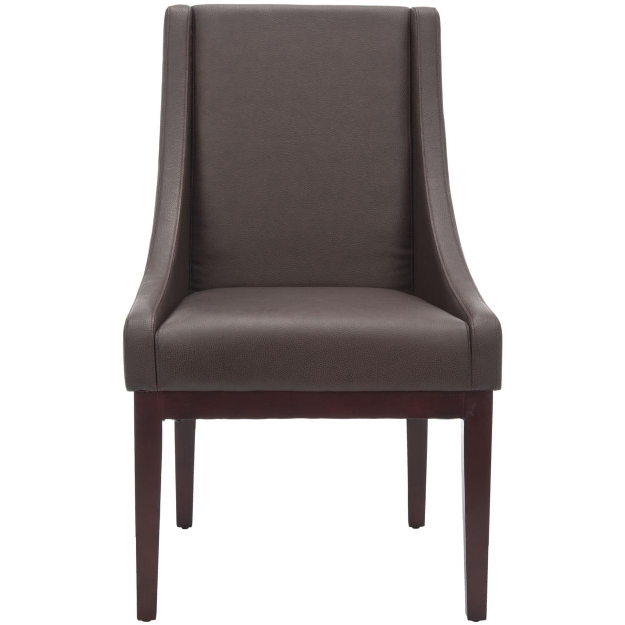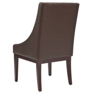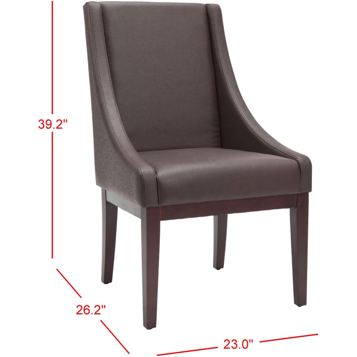 SAFAVIEH Leather Sloping Arm Chair Brown The simplicity of lines and gently sloping arms of the brown leather upholstered Sloping chair, with legs in dark cherry finish, prove an elegant combination. Slope can dress up casual country dining rooms, add class to classic settings and even rest at ease in contemporary homes.