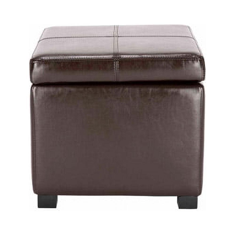 The Madison Square Ottoman is the star of the living room, family room or den. Crafted with sleek brown bicast leather upholstery and birch wood legs in a black finish, its hinged top conceals the bits and bobs that contribute to never-ending clutter, while its cushioned top offers seating for that extra friend-of-a-friend.
