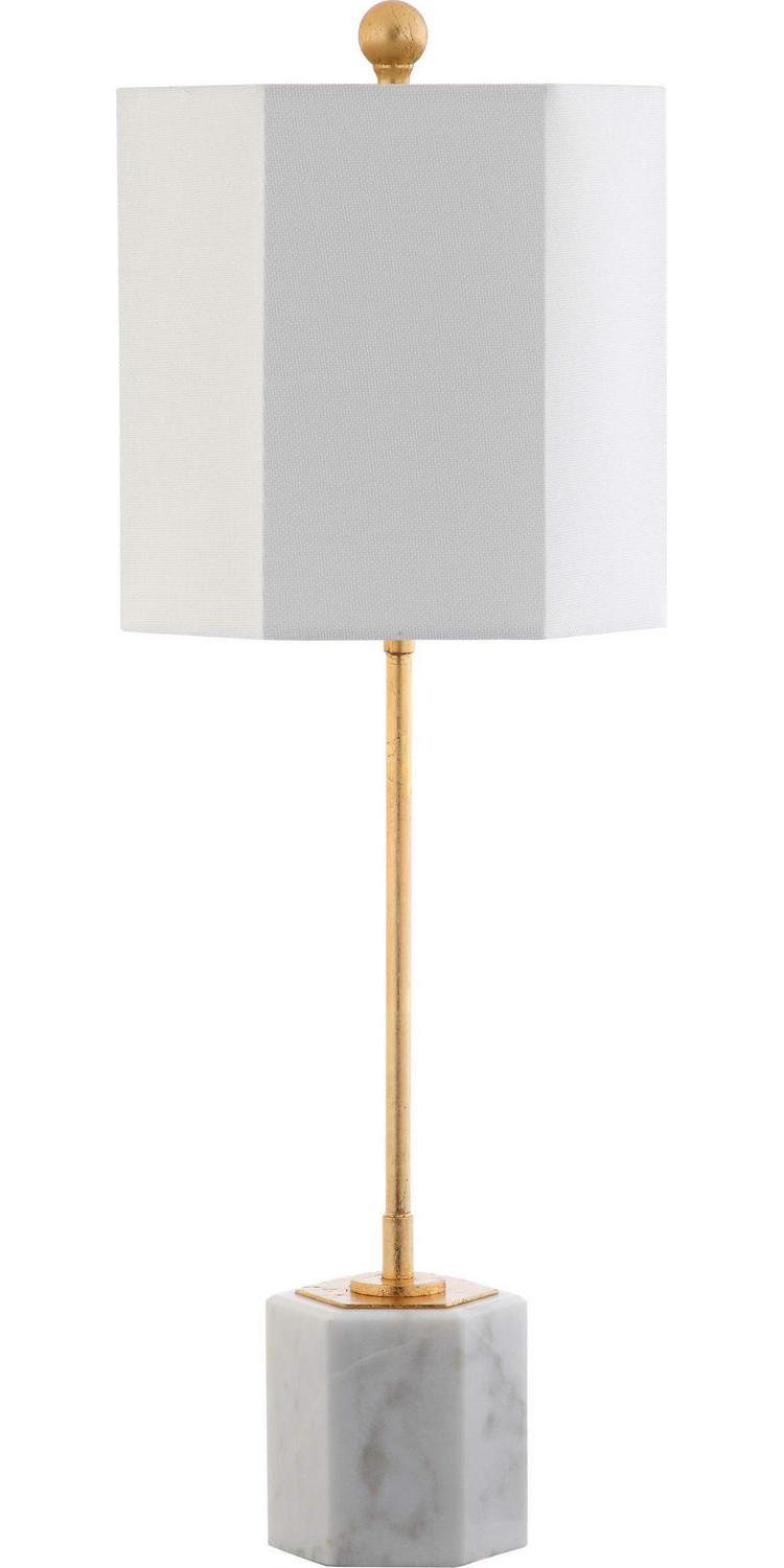 A blend of modern minimalist lines and luxurious material, this contemporary marble table lamp brightens any living room. Designed with a smooth white marble base and a sleek metal body with gold finish, its off-white hexagon shade adds a dramatic touch.- Contemporary design adds a chic look to your home