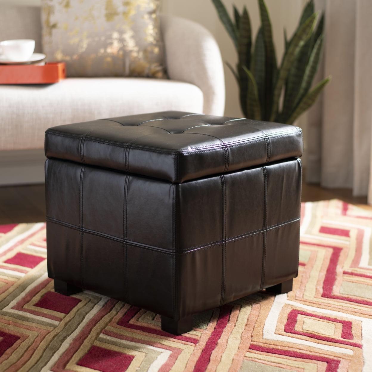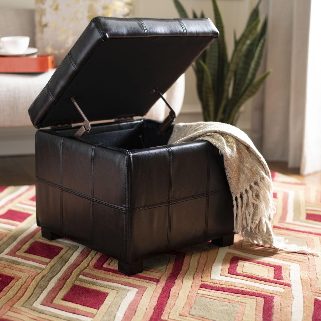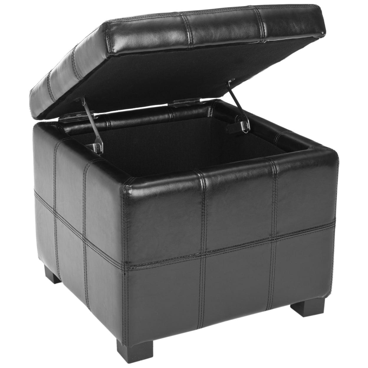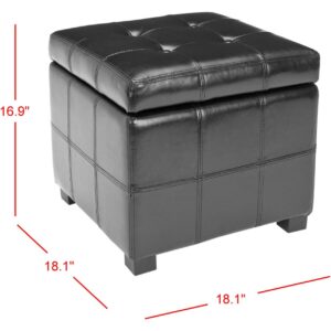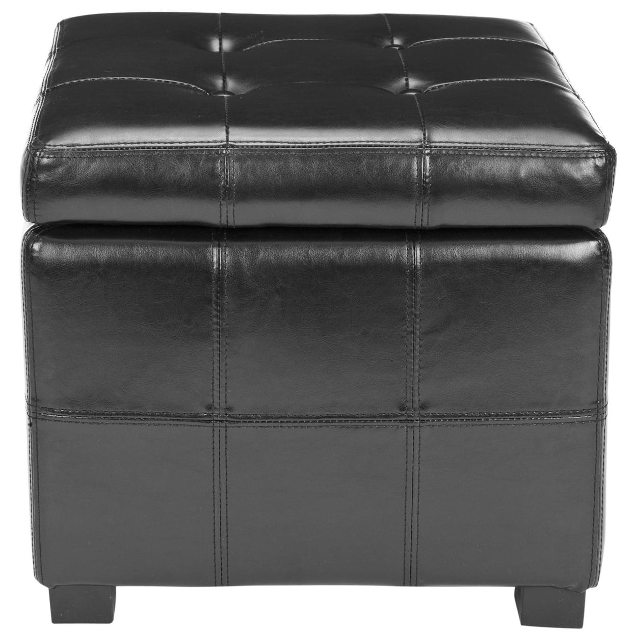 SAFAVIEH Maiden Square Tufted Ottoman Black The Maiden Square Tufted Ottoman is an indulgence in luxe, functional contemporary style. Crafted with black birch wood and black bi cast leather, its posh tufts conceal ample storage space below. Ideal for any room in need of a chic, functional update.
