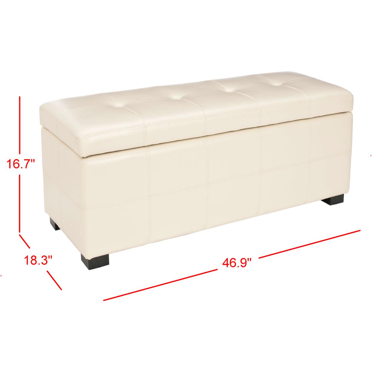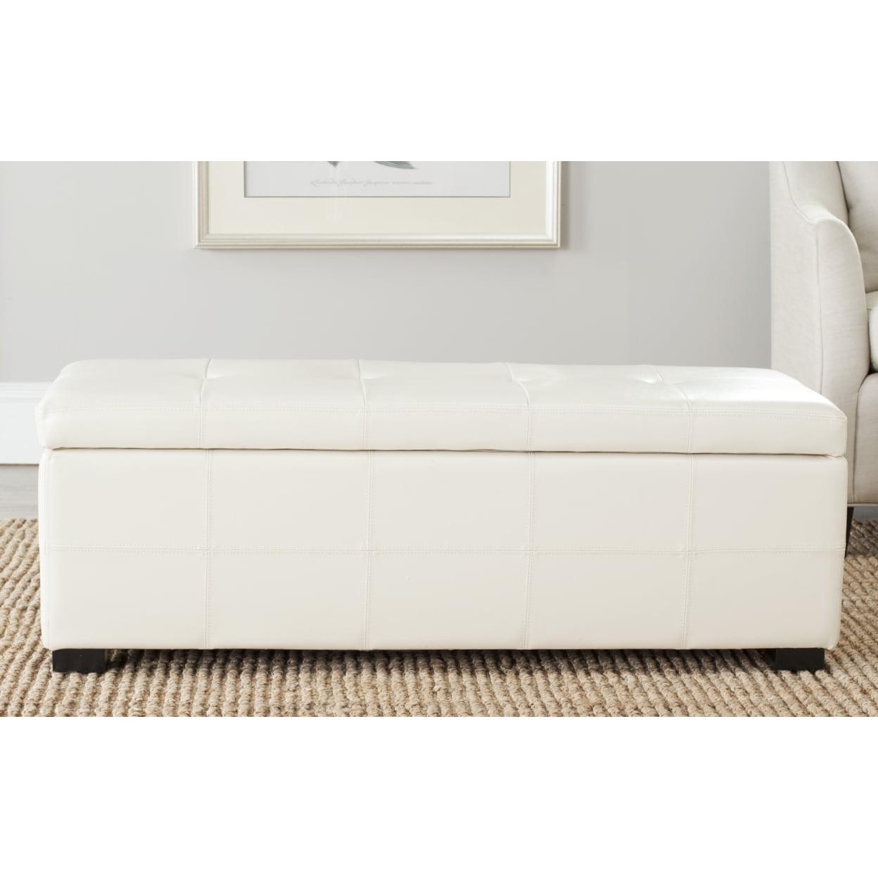 SAFAVIEH Maiden Tufted Storage Bench Large Flat Cream Additional seating and storage is always welcome and the Large Maiden Tufted Storage Bench offers both. Crafted with birch wood in black finish and flat cream bicast leather, this super sized piece brings just as much style as it does substance.