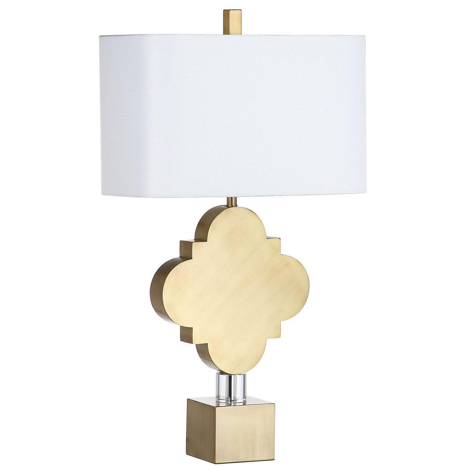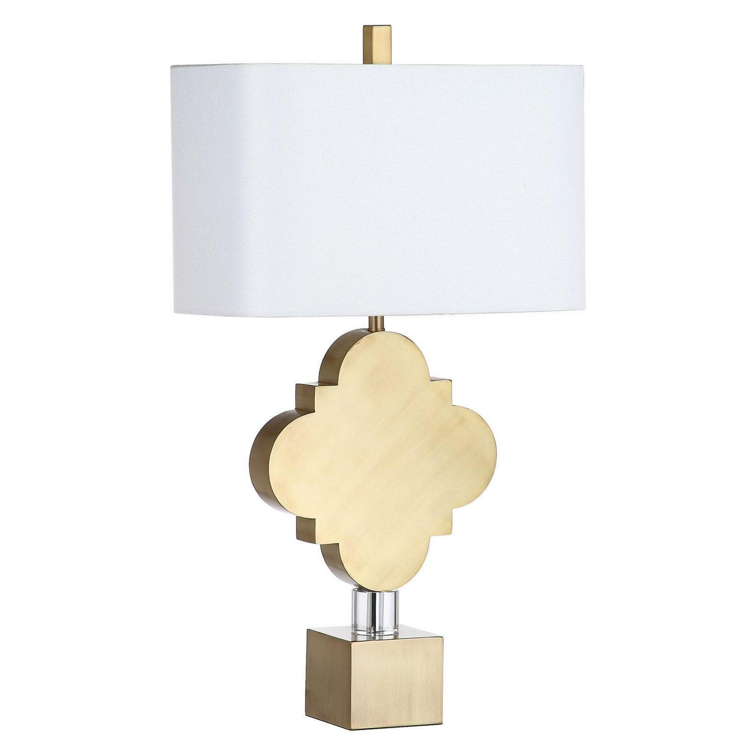 The Safavieh Marina Trellis 31.5 in. Table Lamp showcases a glamorous gold finish on a quatrefoil-shaped frame. Double-crystal accents on the thick, block base add a touch of everyday-elegance to this chic table lamp. A rectangular, cotton shade in a crisp white hue finishes this lamp in bold, contemporary style.