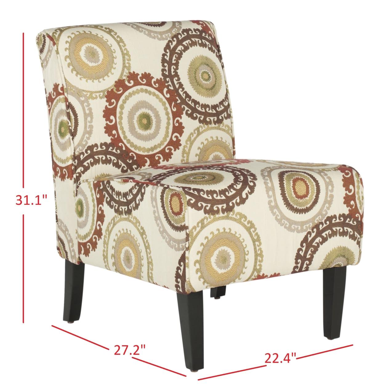 SAFAVIEH Marka Armless Club Chair Terracotta / Brown Our Marka Armless Club Chair features a clean and elegant design perfect for smaller spaces. A generously padded seat and back wrapped with earthy sunburst motifs in beige, brown, orange, and green cotton, sit atop sturdy birch wood legs in a dark brown finish.