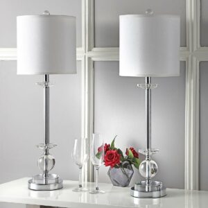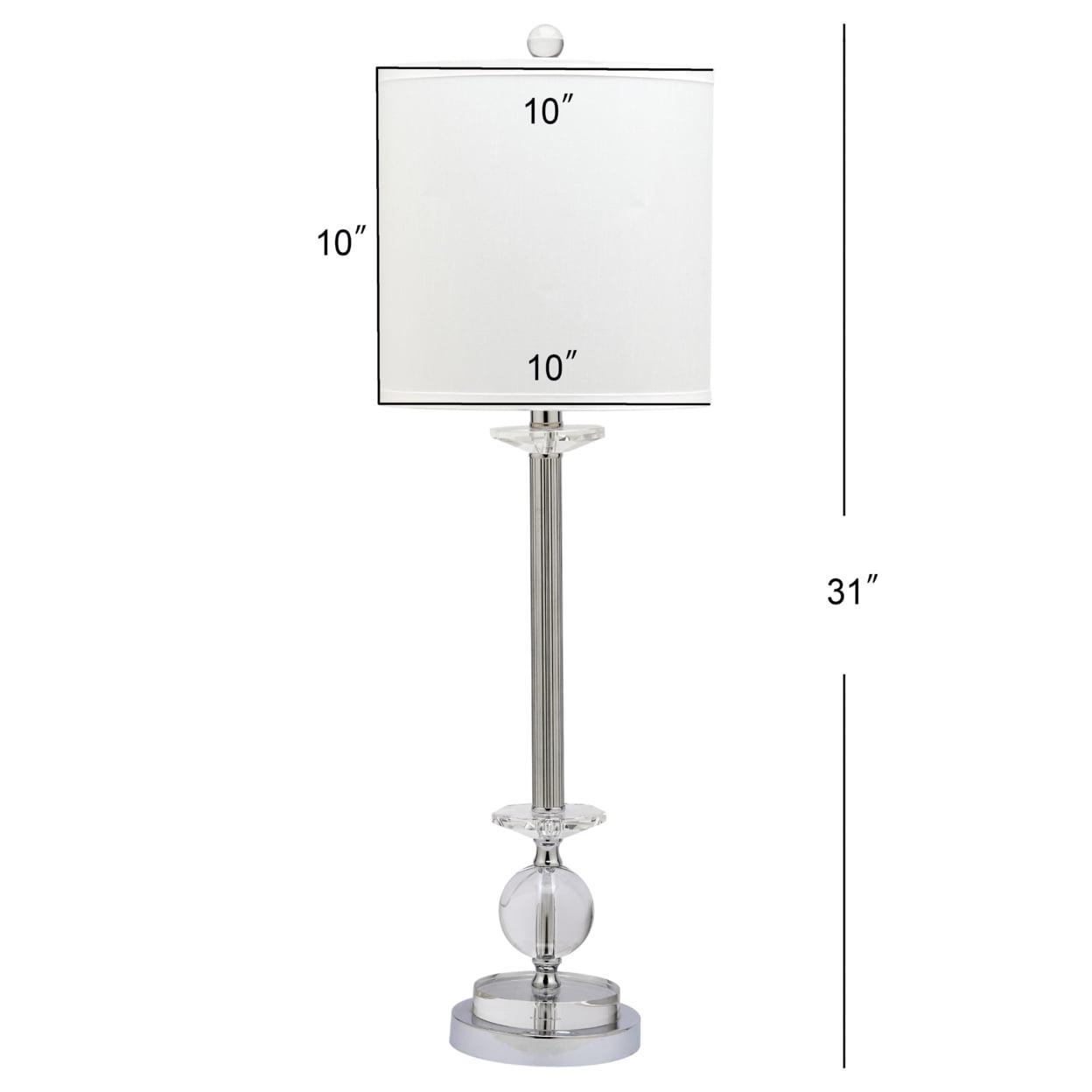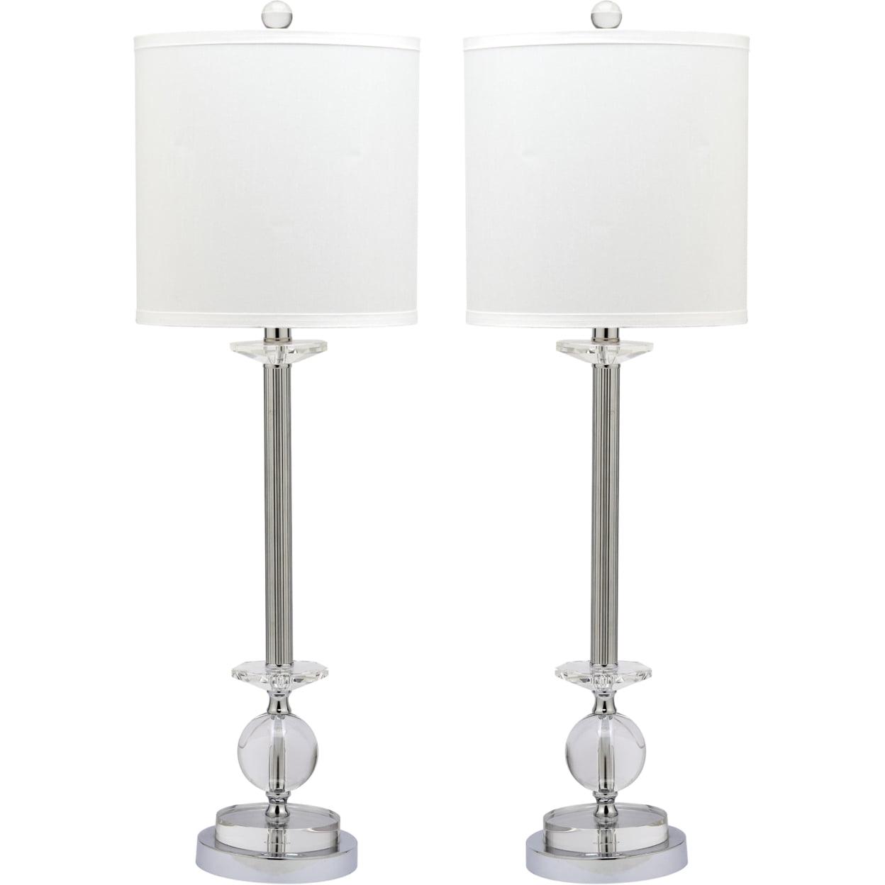 SAFAVIEH Marla Crystal Candlestick Lamp (Set of 2) | Crystal | The versatile Marla Crystal candlestick lamp transitions easily between classy and classic. A contemporary take on candlestick lamps, the set pairs glossy chrome with crystal spheres, and crisp white shades for an understated glamorous finish. Begin your rug, furniture, lighting, outdoor, and home decor search and discover over 100,000 SAFAVIEH products today.