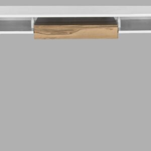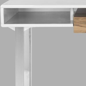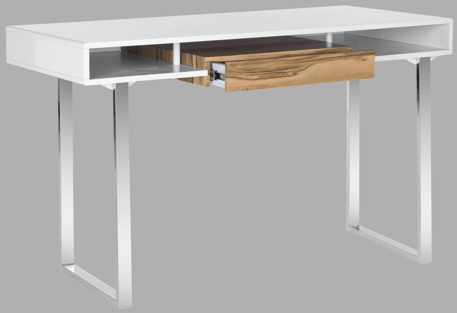 Essential clean lines and a slender form make a refined statement in the contemporary Emma writing desk. A polished steel frame serves as an elegant counterpoint to the white lacquer top and wood-finished desk drawer for stashing office essentials.