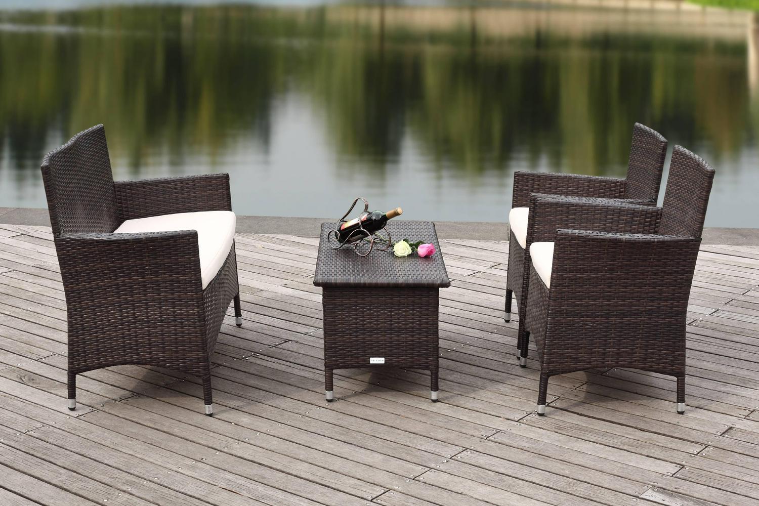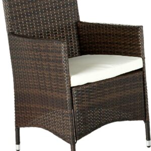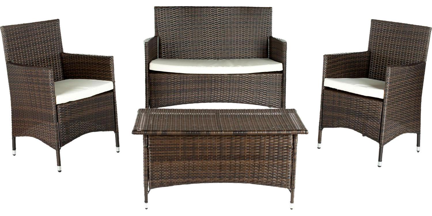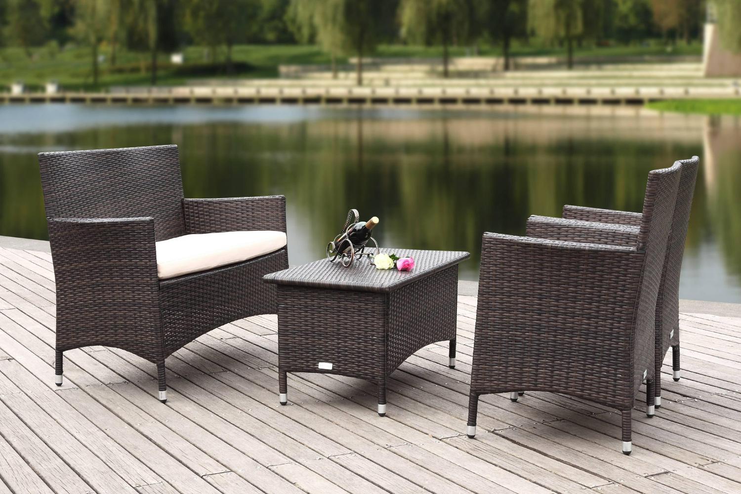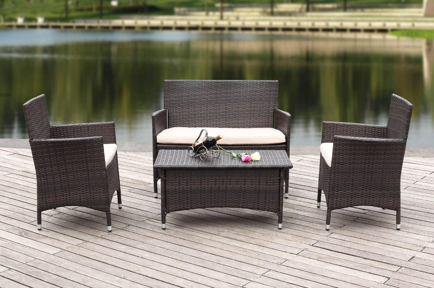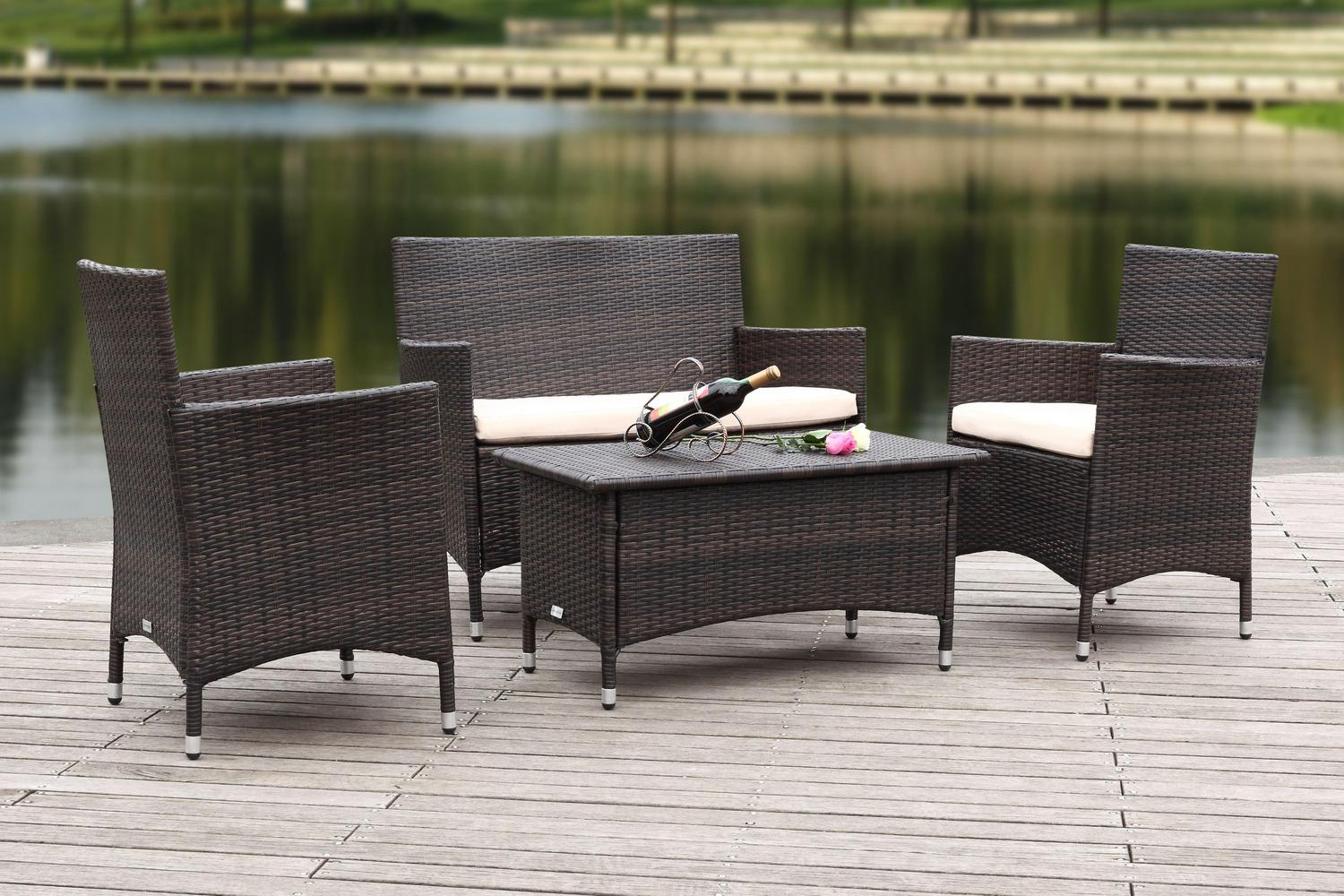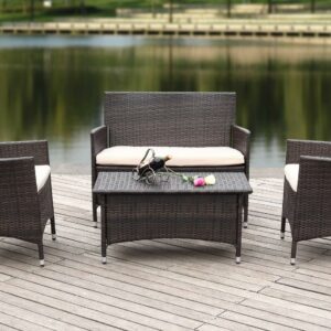 With clean lines and rich materiality, this four-piece wicker outdoor set brings casual elegance to the porch or patio. Crafted of all-weather PE wicker in brown, its cushions are upholstered in cream all weather Terylene fabric for easy-care.