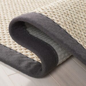 SAFAVIEH Natural Fiber NF143D Marble / Dark Grey Rug Embrace the tranquility of this richly textured rug from SAFAVIEH’s Natural Fiber Collection. Featuring tightly woven sisal fibers with a linen border, this rug gives any room a sleek well-defined look. Perfect for numerous types of decor, such as transitional, contemporary, coastal, and farmhouse, this rug can be seamlessly integrated into any home due to its neutral colors. Rug has an approximate thickness of 0.25 inches.