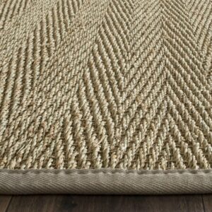 SAFAVIEH Natural Fiber NF115P Natural / Grey Rug Add warmth and a carefree seaside ambiance to your home with the organic beauty of this seagrass rug from SAFAVIEH’s Natural Fiber Collection. Bordered in cotton twill, this rug’s clean, neutral pigments and elegant herringbone design allow for unlimited decorating versatility. Rug has an approximate thickness of 0.25 inches.